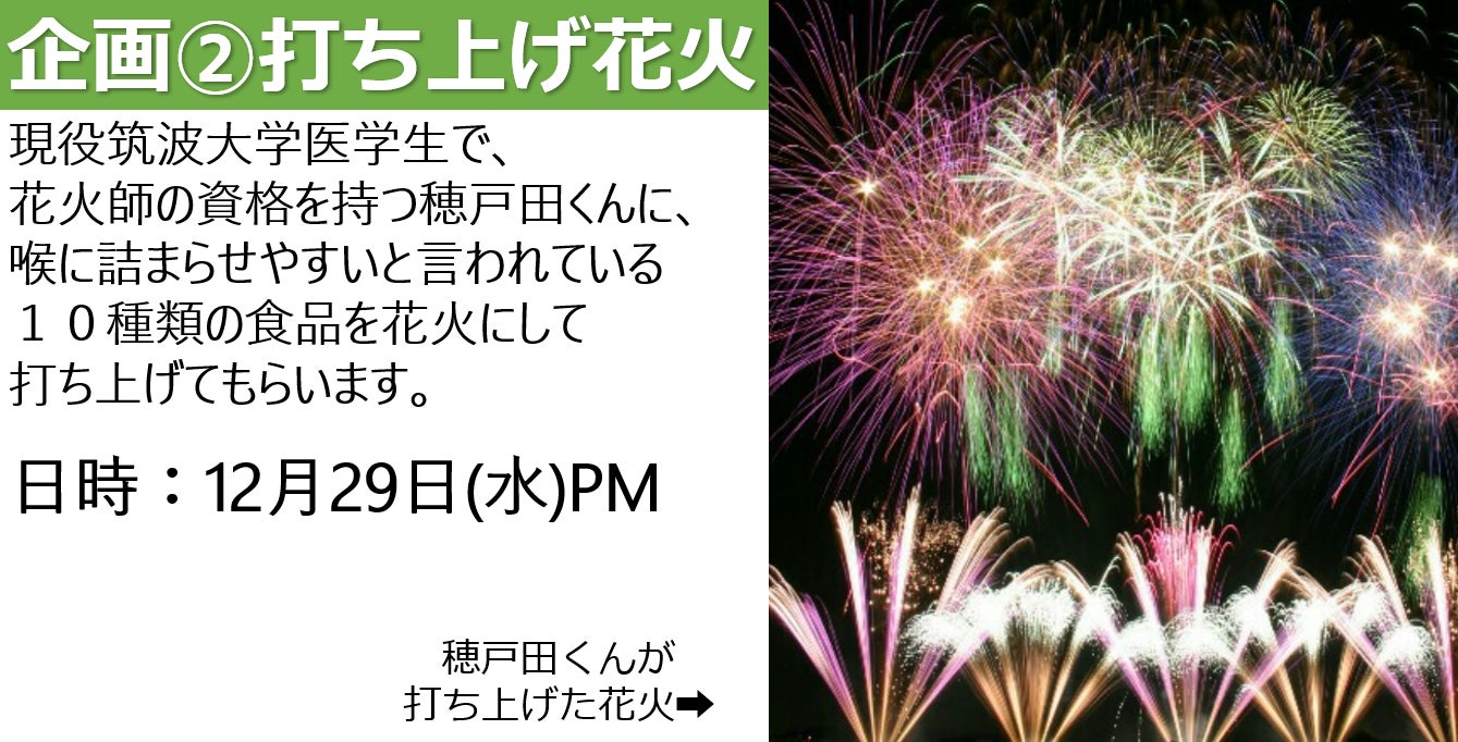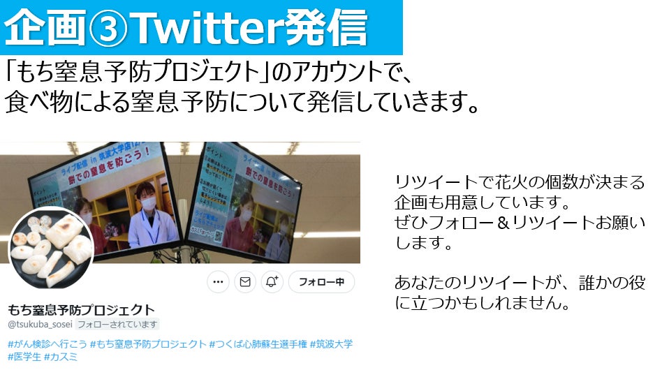 花火の様子は、もち窒息予防プロジェクトTwitter(@tsukuba_sosei)で配信予定です。
