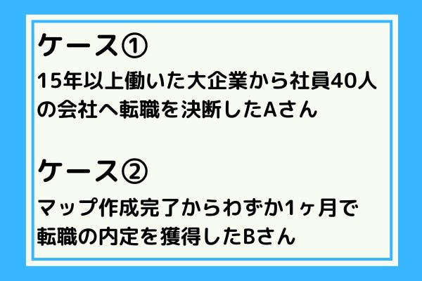 お二人とも置かれている環境や悩みの質は違いました。マップ作成時も考えが二転三転してかなり思考整理に苦労していましたが、1ヶ月かけてじっくり自分と向き合った結果、転職の軸が明確になりました!そして、自分の目的に沿った転職ができました。