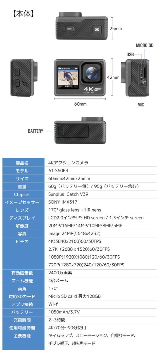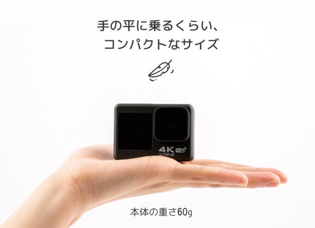 4Kアクションカメラは、横6cm×縦4.2cmのコンパクトサイズで60gの軽さでいつでも気軽に本格的なイメージを撮ることができます。
