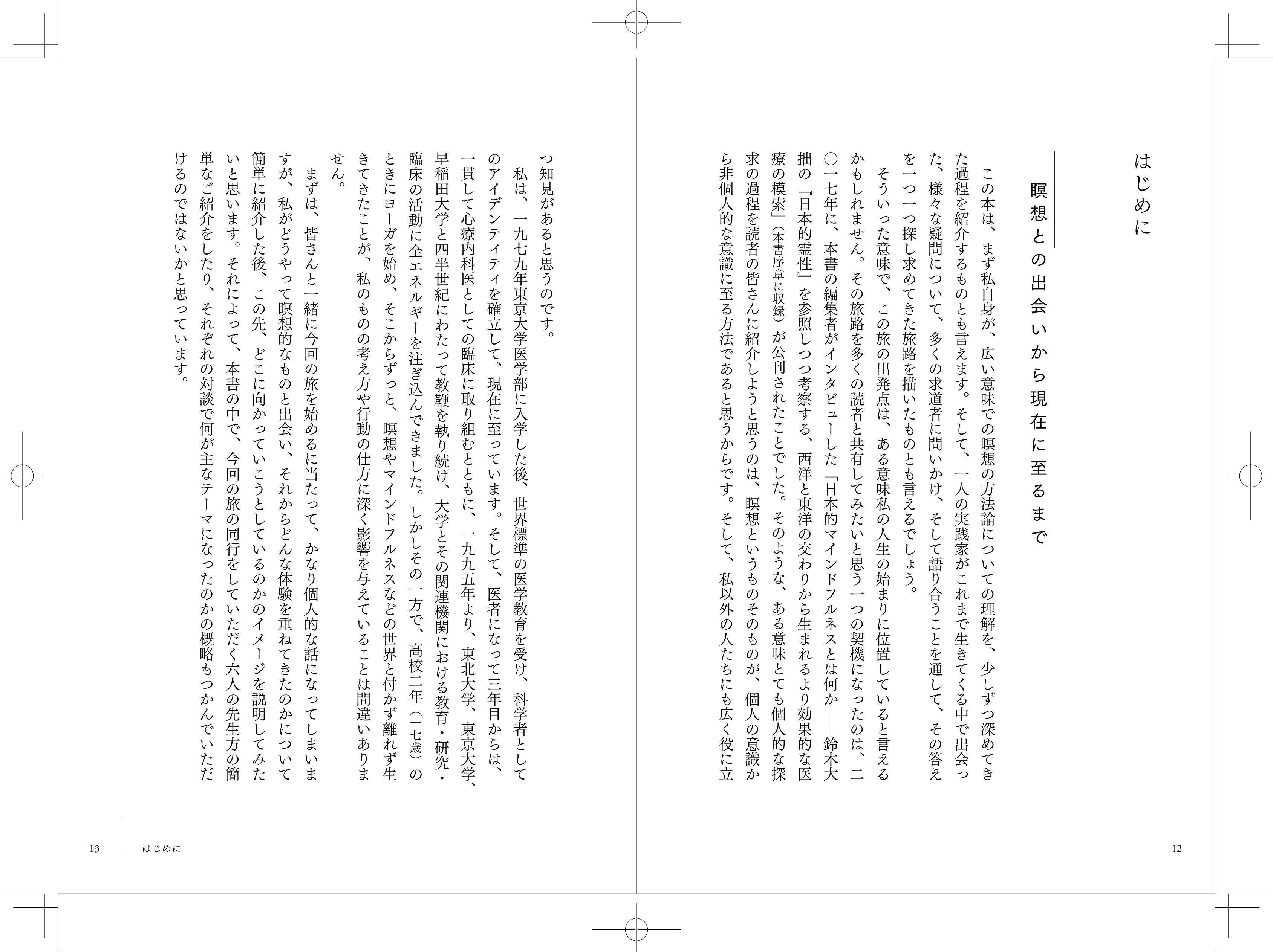 本書のコンテクストである熊野宏昭先生の瞑想を始めたきっかけから今に至る旅路を語っていただいています。また本書全体の見取り図にもなっていますので、どうぞお読みください。