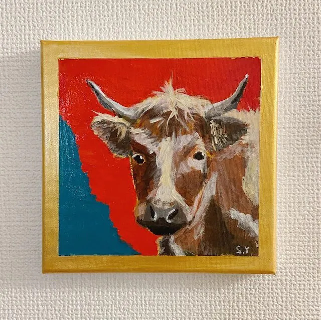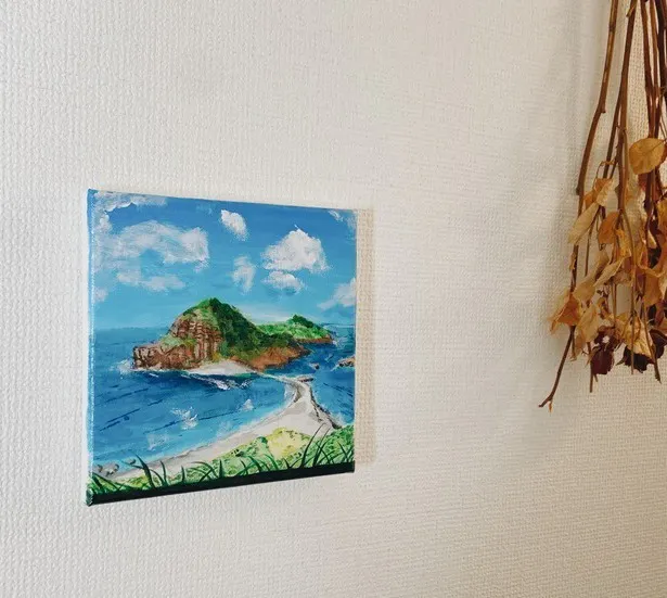 正方形のキャンバスに描いてお届けしますので、賃貸のおうちでも壁に画鋲を使って簡単に飾ることができます。
