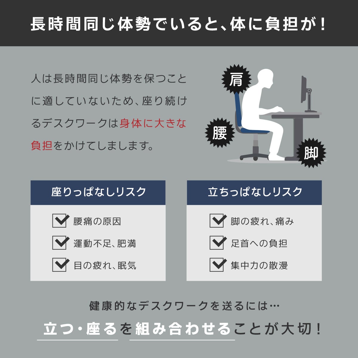 ②長時間同じ体制でいると身体に大きな負担を軽減できるデスク