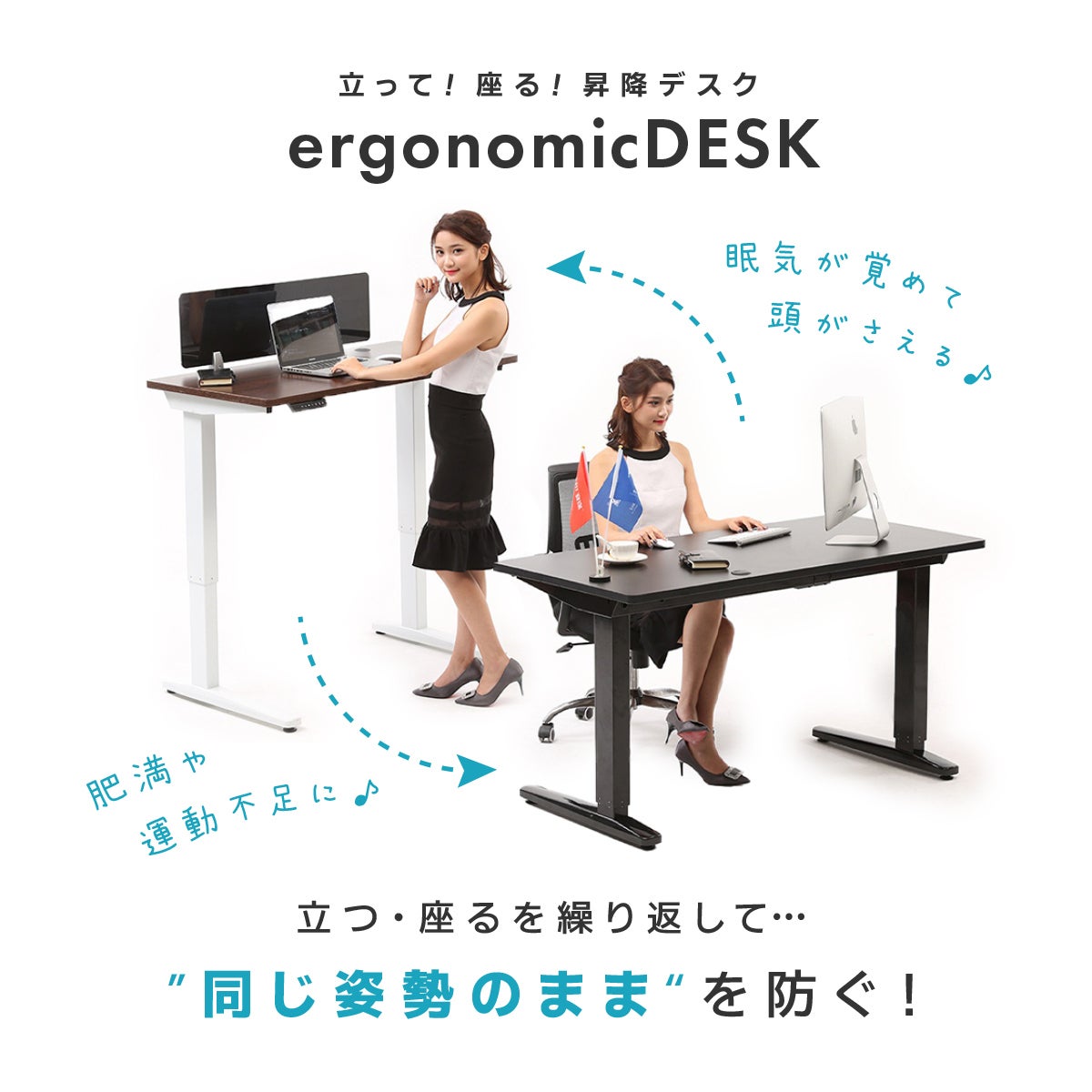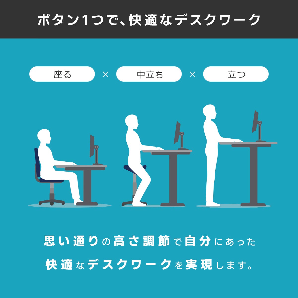 ①自分の高さに調整自在!立って!座る!電動昇降デスク