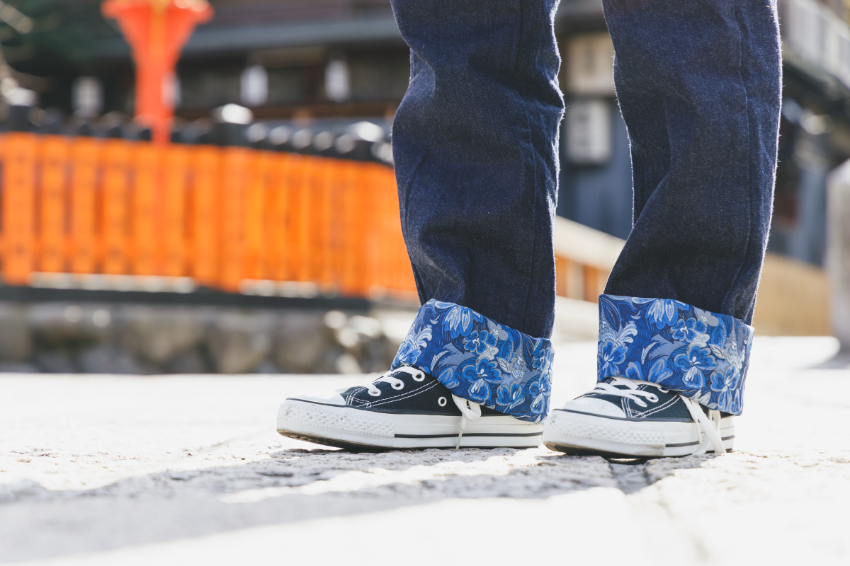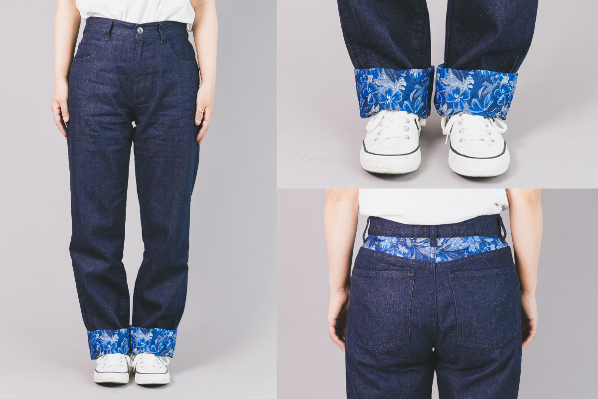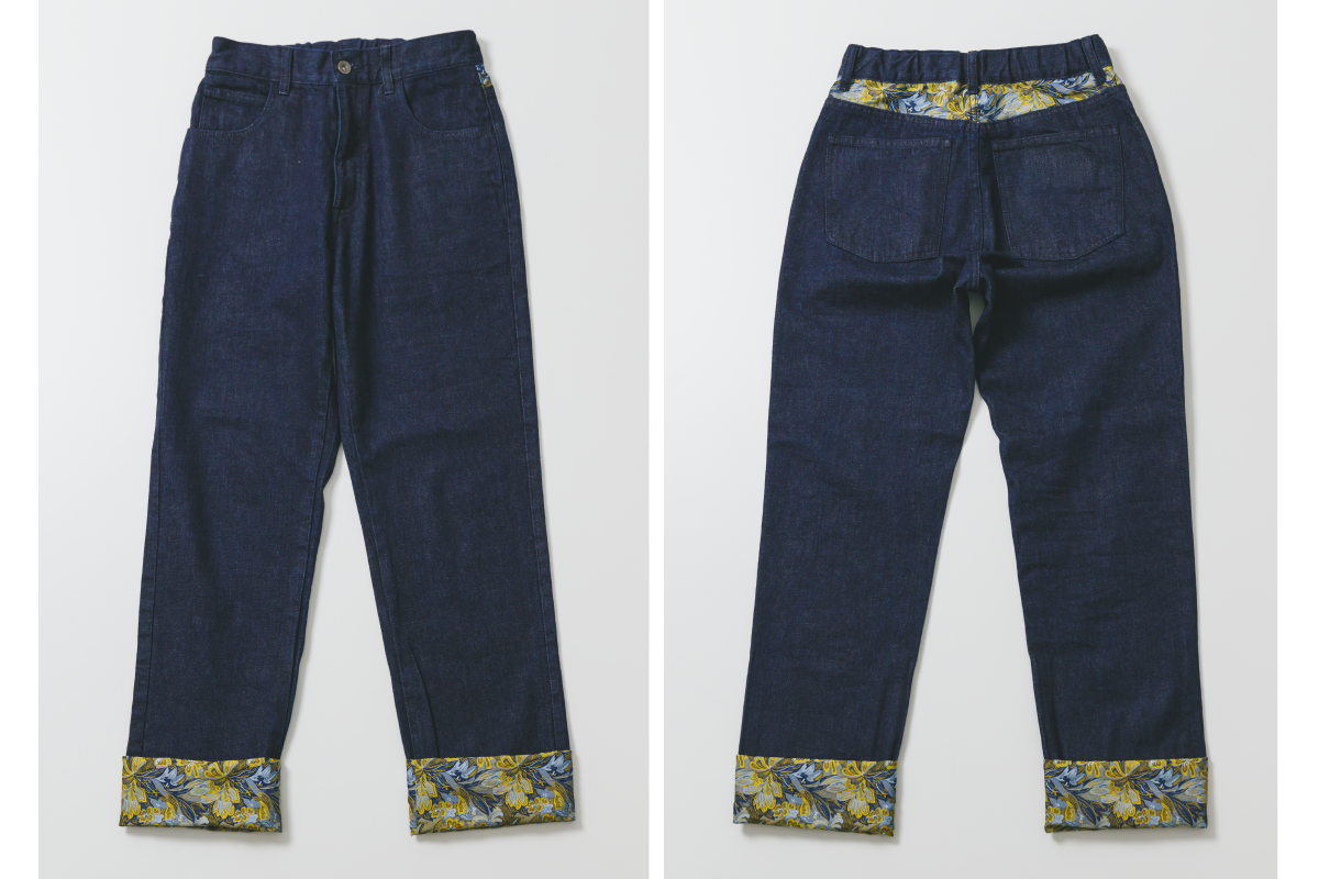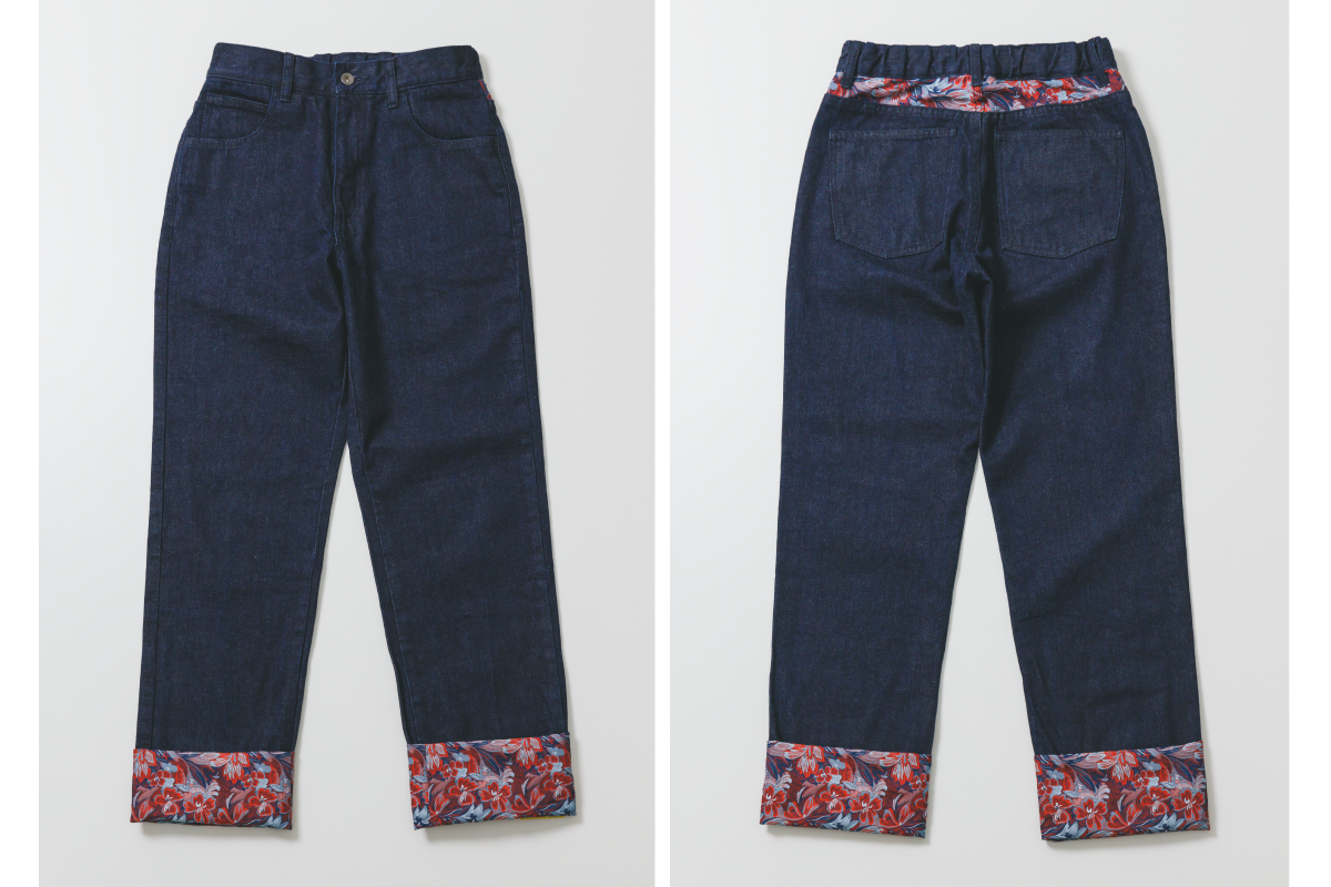 裾部分とバックヨークに京都の西陣織を施したデザインのコラボジーンズです。