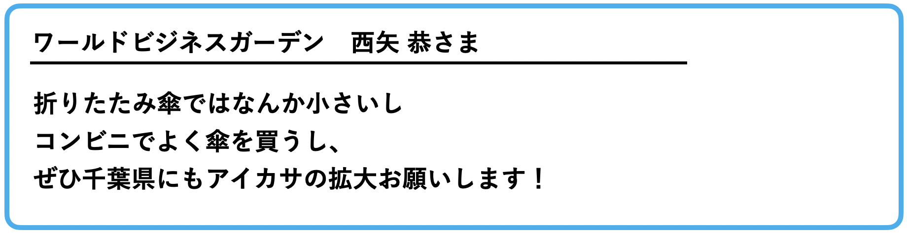 小さな輪を広げて、未来の子供たちから、「昔って傘を買っていたんだね」という声が出るくらい当たり前の価値観を一緒に作っていきましょう!
