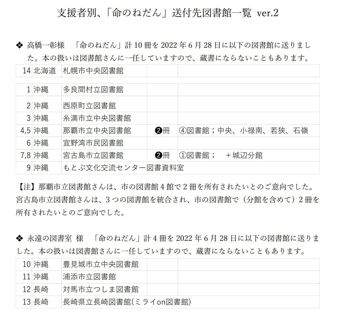 ※ 1つの図書館で2冊希望された図書館さんの場合、「2つの図書館への寄贈」扱いにしますが、実際には送料が少なくて済む可能性があります。送料の余剰分は貯め、2,000円毎に、新たな1つの図書館への『命のねだん』1冊の寄贈に使用させてもらいます。