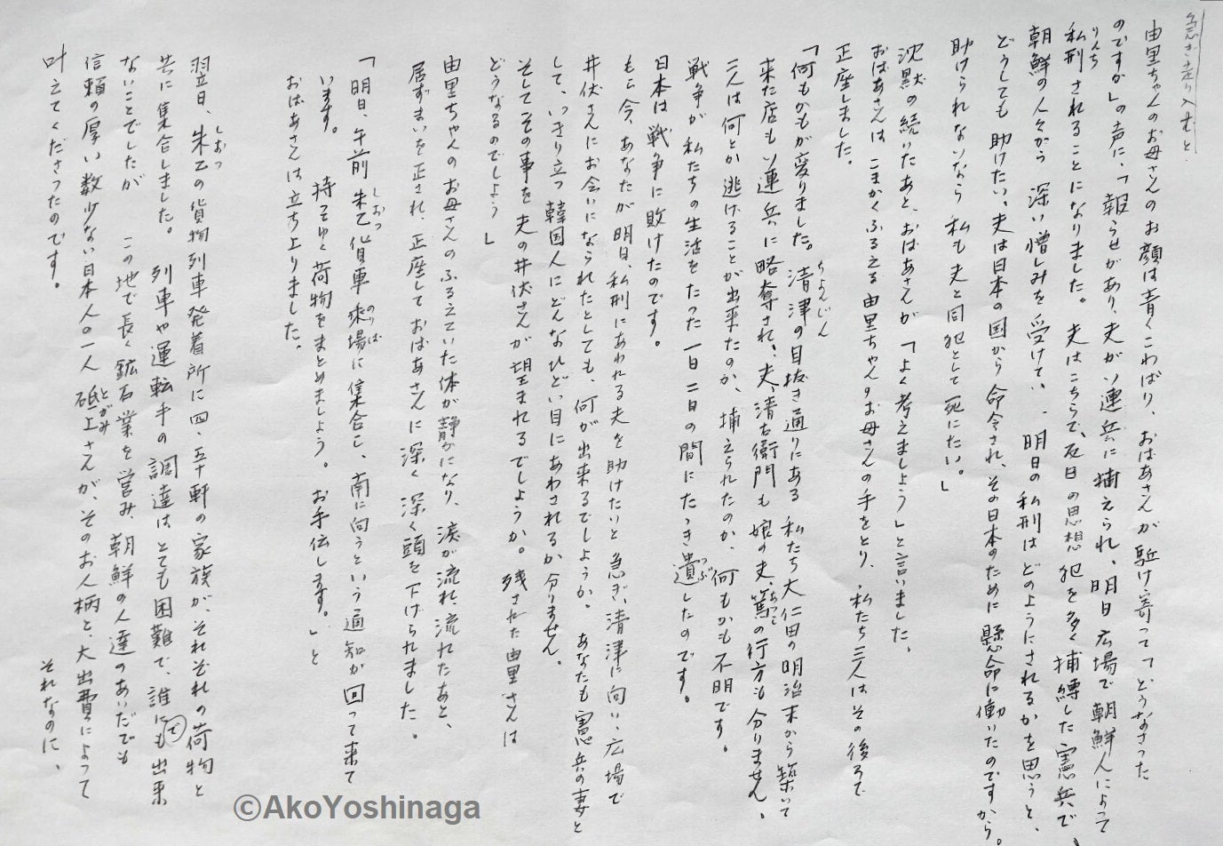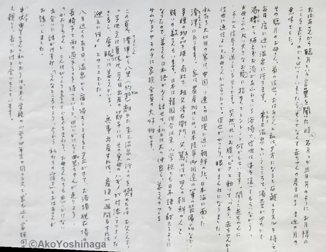 1つめの物語は、朝鮮とソ連(今の北朝鮮とロシア)の国境付近に住んでいた6歳の娘(主人公)と出産を控えた母と祖母が、突然「終戦となりソ連の占領下に置かれるから、すぐ帰国を」との知らせを受けて、アメリカ軍占領下である38度線の南まで自力脱出しなければならなくなり、生活の全てを現地においたそのままで、飢えと恐怖の中を、一家心中未遂するほどの悲惨な目にもあいながら、何とか38度線の南までたどり着く物語です。作者が友人の体験をベースに想像を膨らませて創りました。