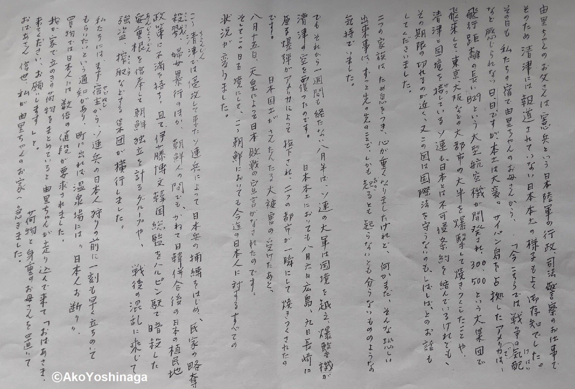 そして、主人公たちの目を通して戦争を感じてもらったあと、みんなで自由に思いを紹介しあえたら、大学のゼミのように、刺激や感動、ひらめきを与え合う場になるのではないかと思いました。紙面上ではしゃべれませんけど、みんなの思いを紹介することはできると思いました。2つの物語と50-100人の思いや考えを一緒に載せた『新しい形の本』を『改訂版』として発行したい。それが企画者の夢です。もし実現すれば、物語を読んで感じたり考えたりしたあと、ほかの人の感じたこと考えたこと読み、心の中でいろんな人と対話できるのではないかと思っています。