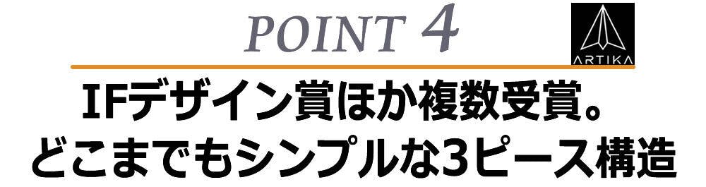 その理由は、主要パーツ数を3つに絞り込むことで壊れにくく永く愛用頂けるようにし、かつ長期間使っても飽きのこない外観を実現するためです。