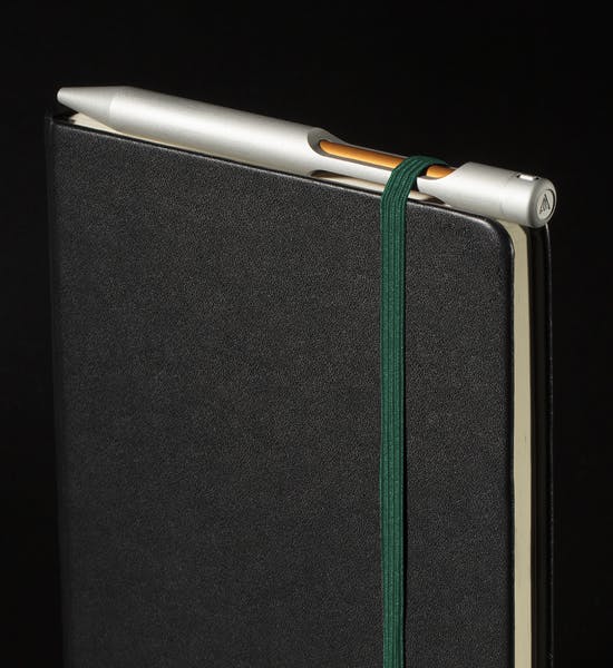 例えば下の画像のようにモレスキン調のバンド付き手帳と一緒に留めても、元々セットだったかのよう。