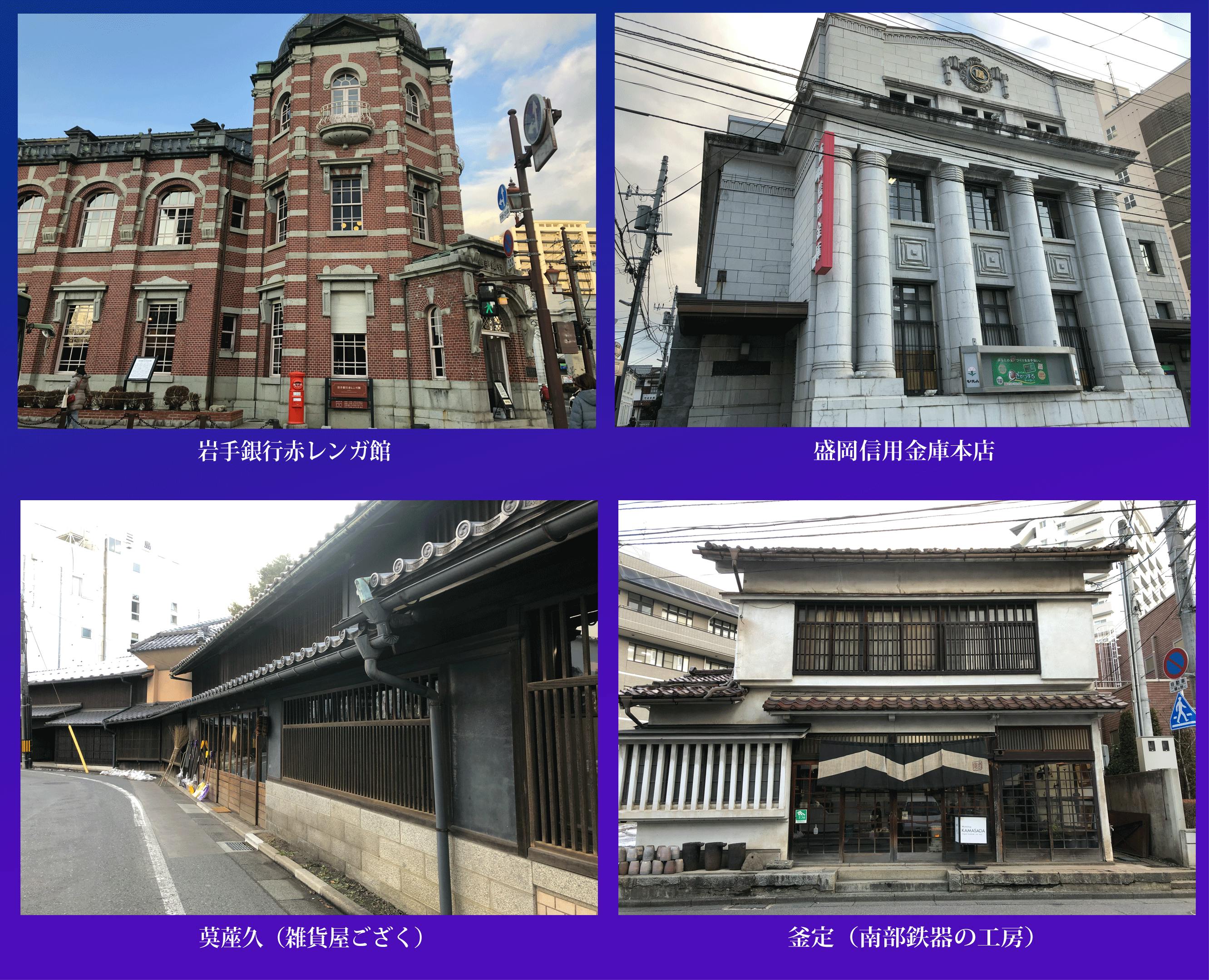 明治から昭和初期に通りに銀行や電灯会社などができ、現在でも江戸時代から昭和初期の面影を残しています。岩手銀行赤レンガ館、盛岡信用金庫本店、茣蓙九(ござく)、南部鉄器の釜定(かまさだ)などがひとつの通りに点在しています。また、手焼きの南部せんべいの白沢せんべい店が番屋のはす向かいにあります。