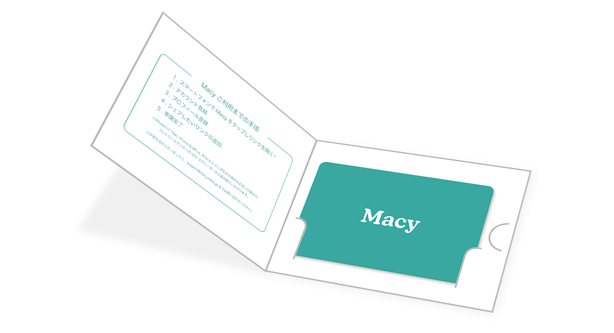 Macyで自己紹介をしましょう!スマートフォンの背面上部をあなたのMacyに近づけ、表示される通知をタップすれば、あなたのプロフィールページに誘導されます。