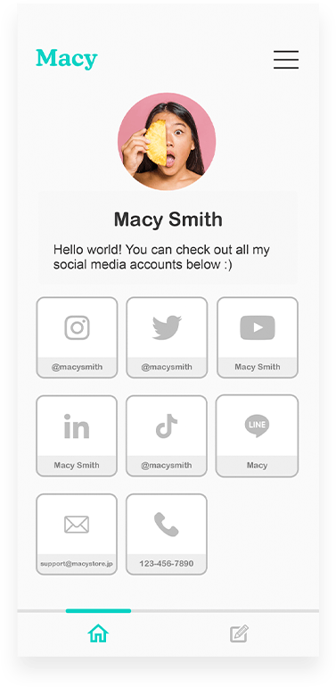 カードを購入された方のみ、『Macyアカウント』へ登録することができます。簡単な登録後にあなたが友達やクライアントに共有したい情報を追加し、プロフィールページを用意しましょう。Macyアカウントはウェブサイトなので、アプリをダウンロードする必要はございません。以下がプロフィールページのイメージです。