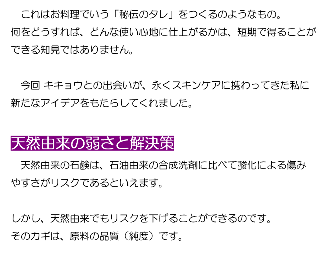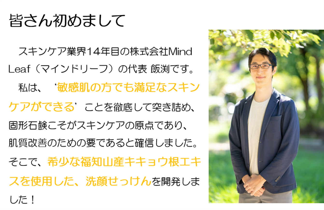 代表は大学卒業後に石鹸メーカーに就職。14年間にわたり、スキンケアの専門性を高め続けてきました。