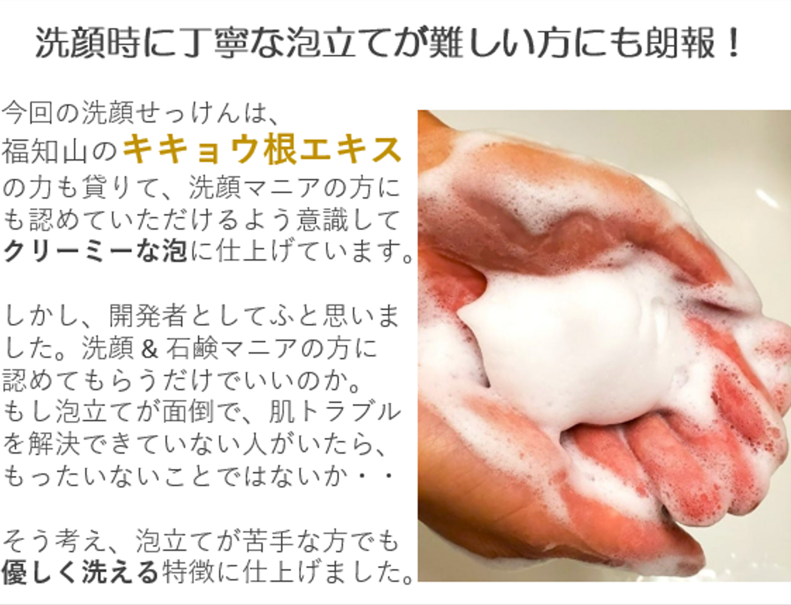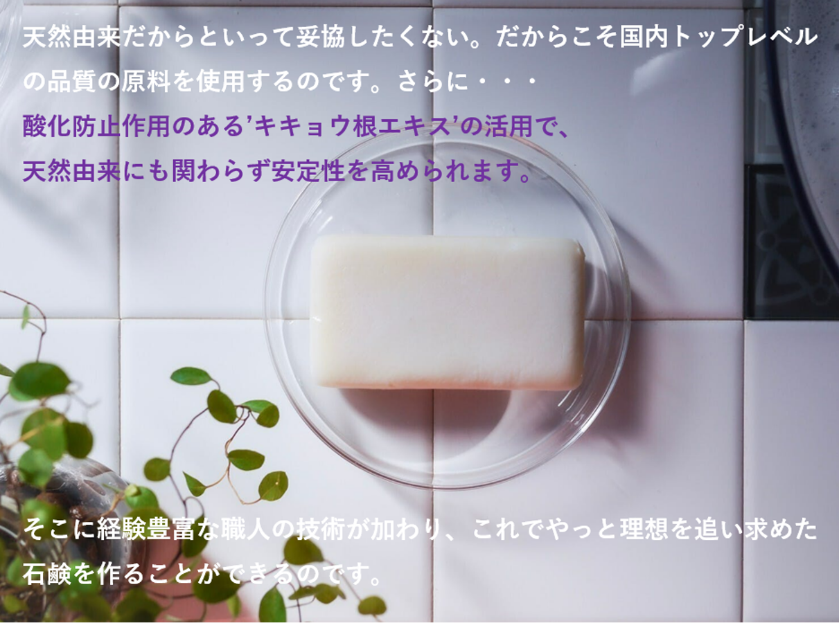 洗顔せっけんと福知山産のキキョウ根(桔梗の花の根の部分)の抽出成分を掛け合わせた、新しい発想の洗顔石鹸の開発にあたり、試作を中心とした開発費用に充てさせていただきたいと考えております。