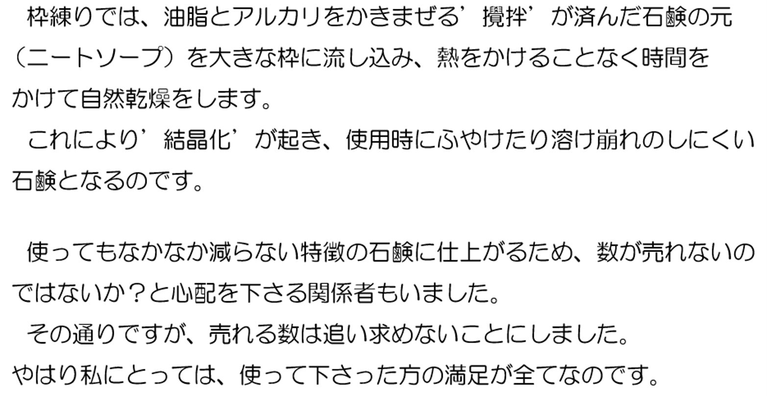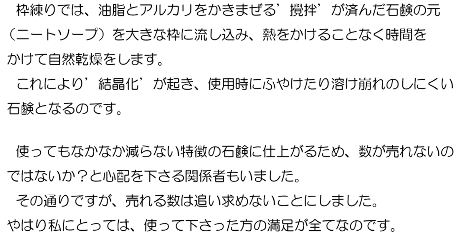 現在は洗顔せっけんの試作を進めており、良い手応えと共に改善を繰り返しながら、完成も間近です。