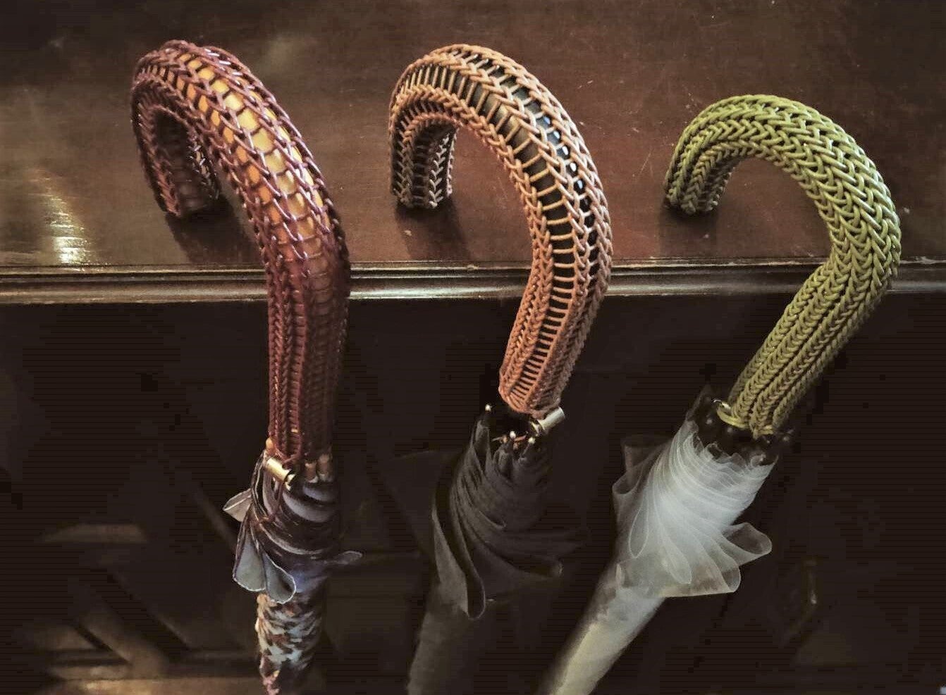 「革製傘の持ち手カバー」は雨の日に活躍する ことが多いため、この水牛革から作られる革コードを使っています。
