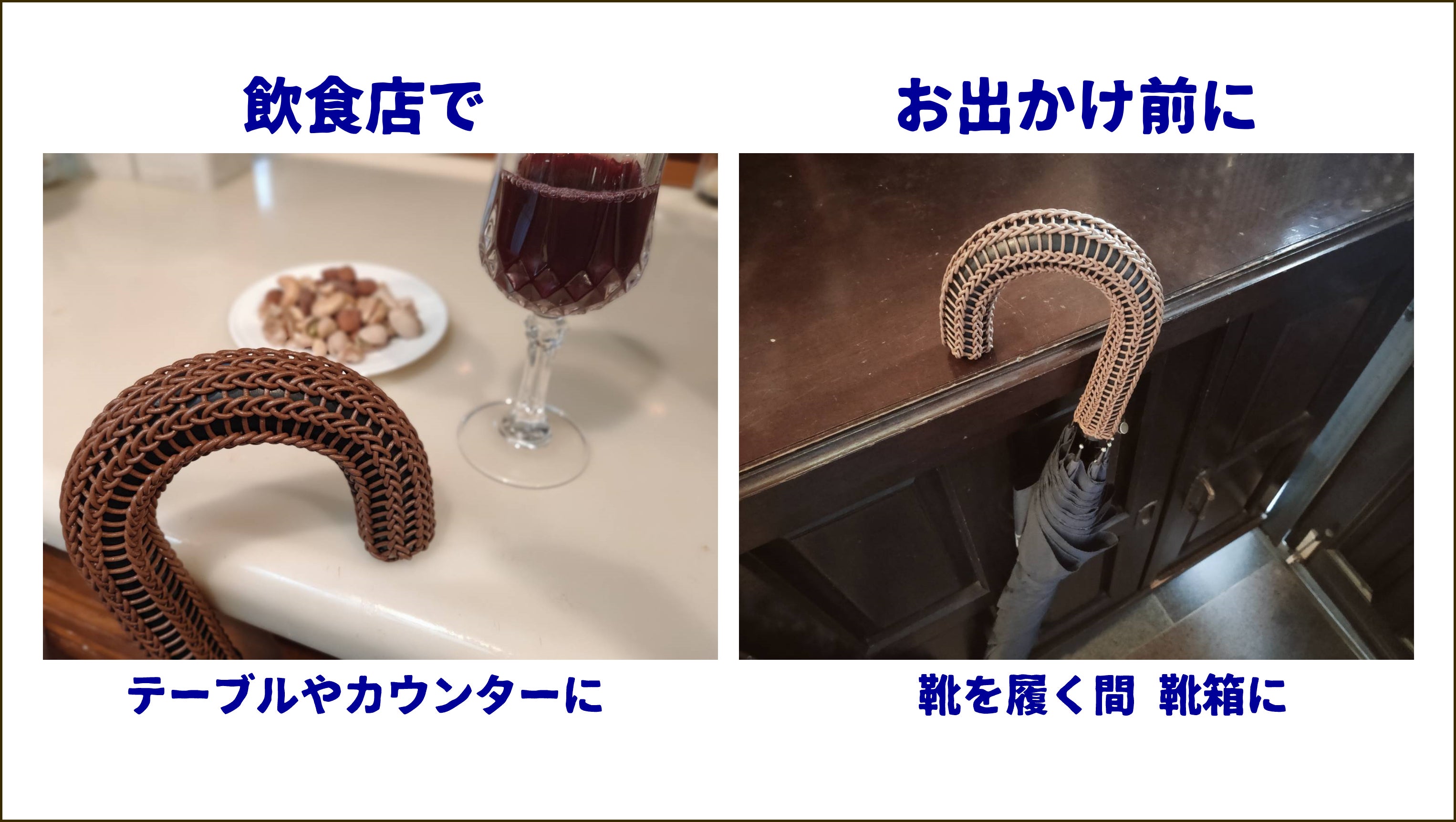 また、テーブルやカウンターにかけておけるので、飲食店でも手元に傘を置いておくことができます。