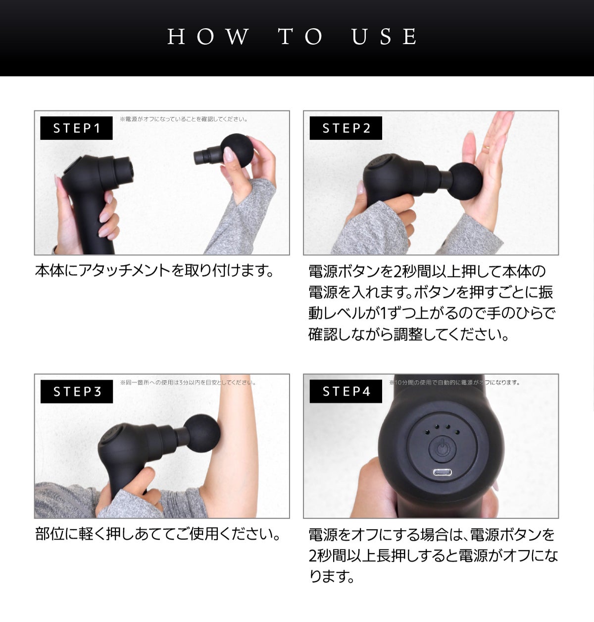 10分経つと自動で電源オフになるので、身体と相談してケア時間を調整してください。