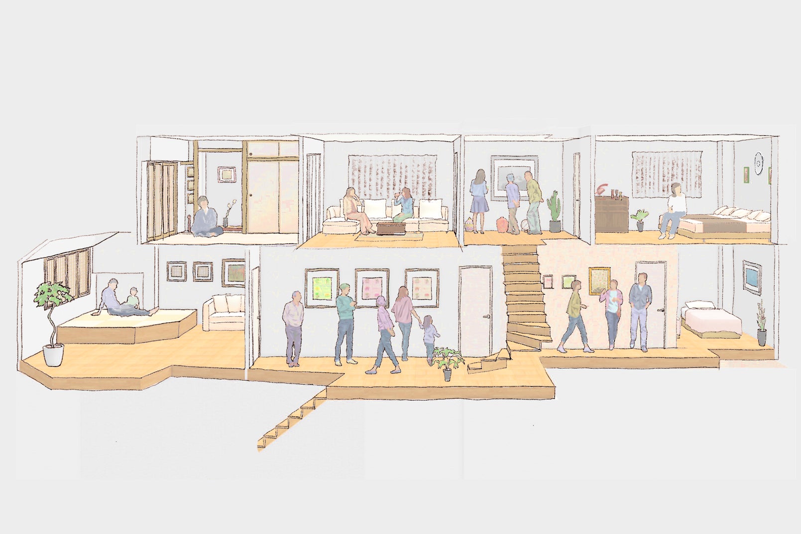 大人数が収容できるつくりになっていて、アートをテーマにした3階建ての一棟貸切型のバケーション・レンタル(民泊施設)になっています。それぞれワンフロアずつの貸切も可能。
