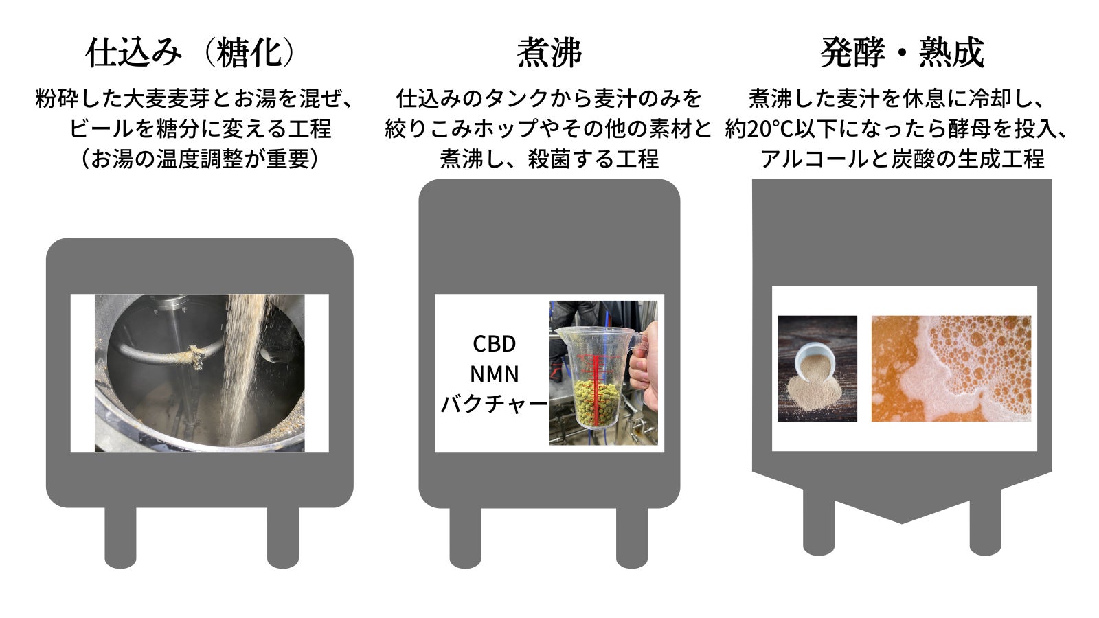CBD、NMN、バクチャーは、煮沸及び発酵の工程に投入し、各素材の良さが残るよう醸造いたします。