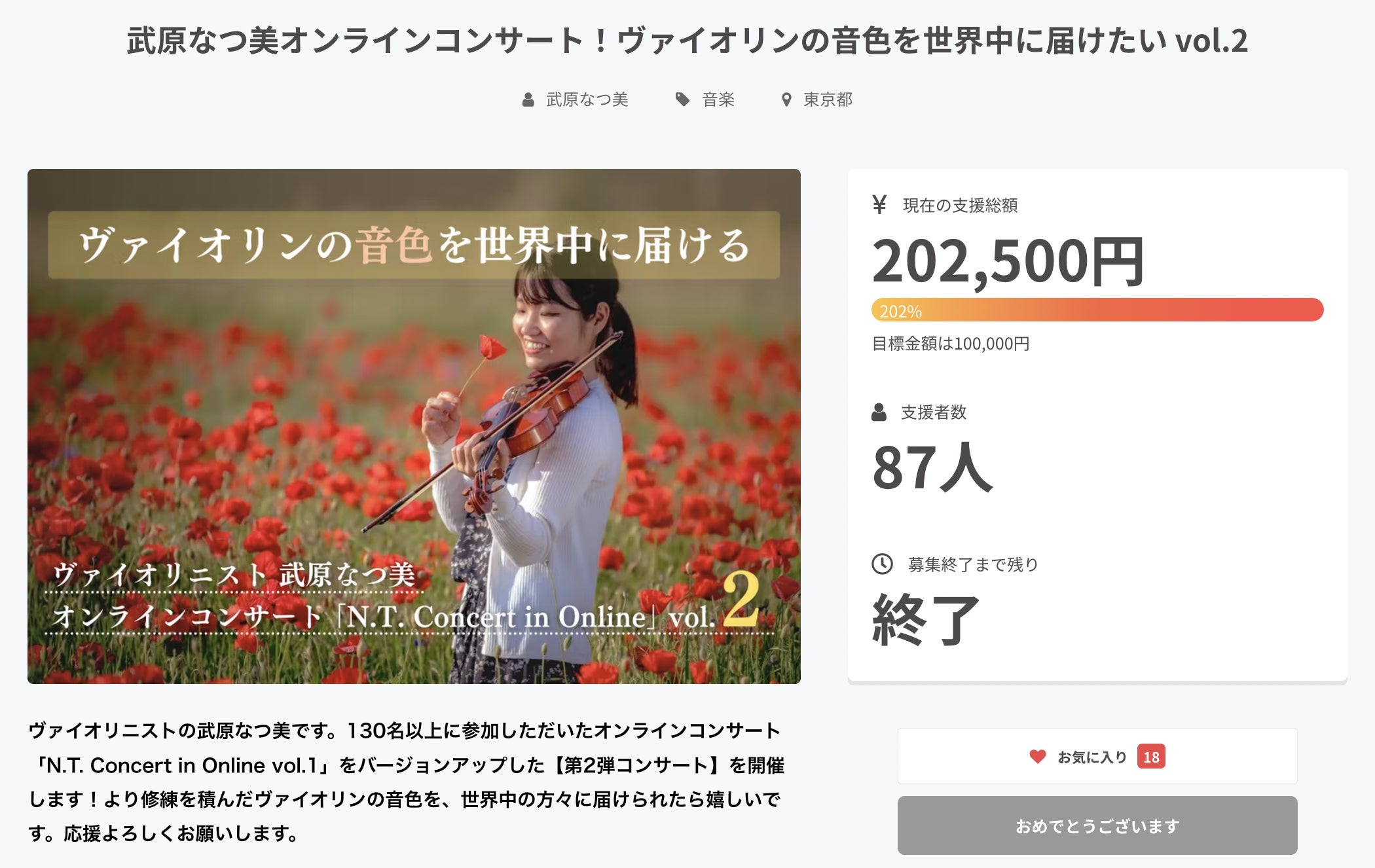 なお、本プロジェクトは All-in方式 で実施しますので、目標金額に満たない場合でも、コンサートの開催およびリターンの履行は確実に実施させていただきます。