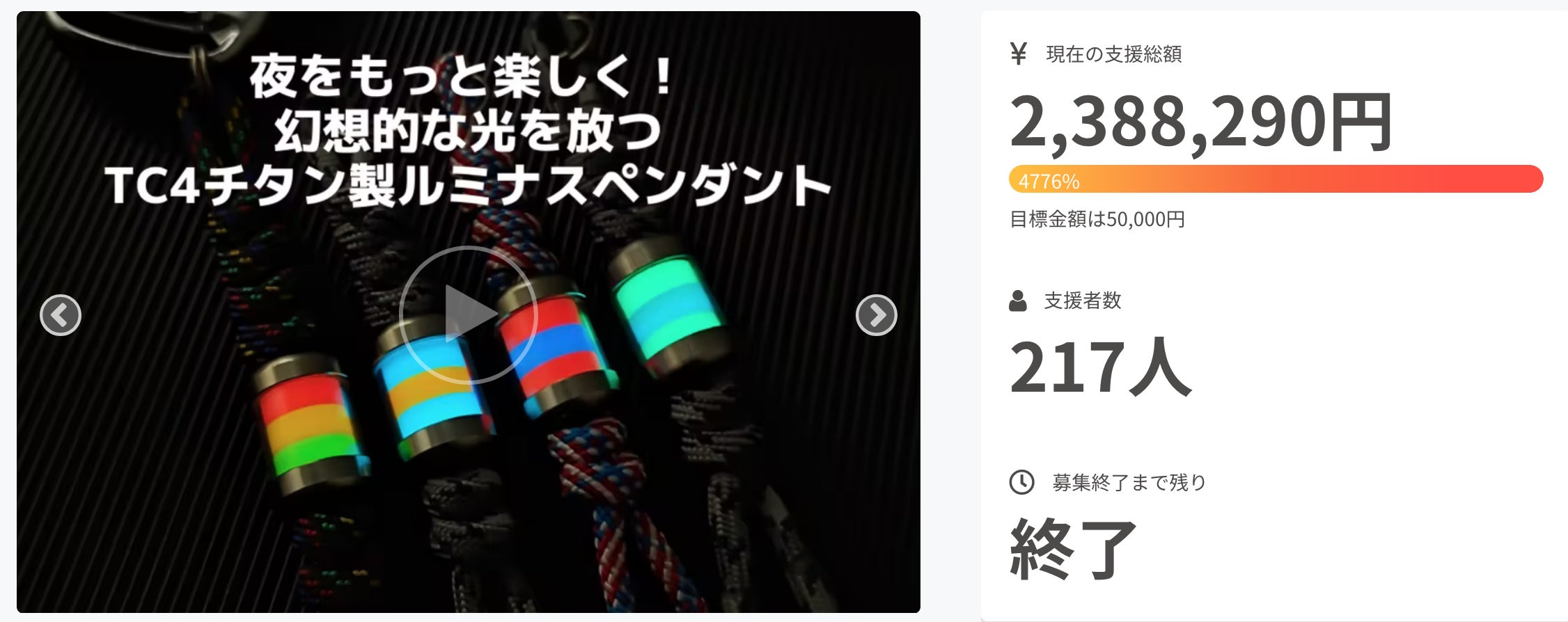 ❶「ご好評につき第2弾!幻想的な光を放つTC4チタン製ルミナスペンダント!」任意商品をご支援いただく