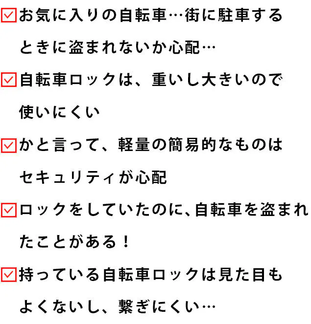フォルディロックなら、大切な自転車を盗難の被害から守りつつ、ロックが「重い」「使いにくい」などの煩わしさもありません。