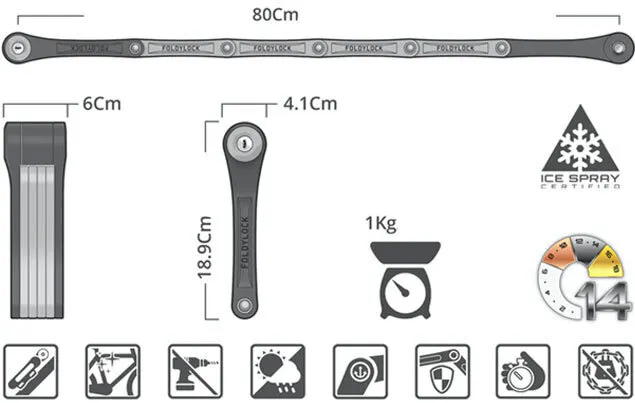 フォルディロックは、軍用のUVポリマーによって施された6つの硬化鋼でできています。接続部分のネジ穴を失くし、ドリルで開閉できないような設計のため接続部分から分解することが非常に難しく、硬化鋼で簡単に切断もできません。