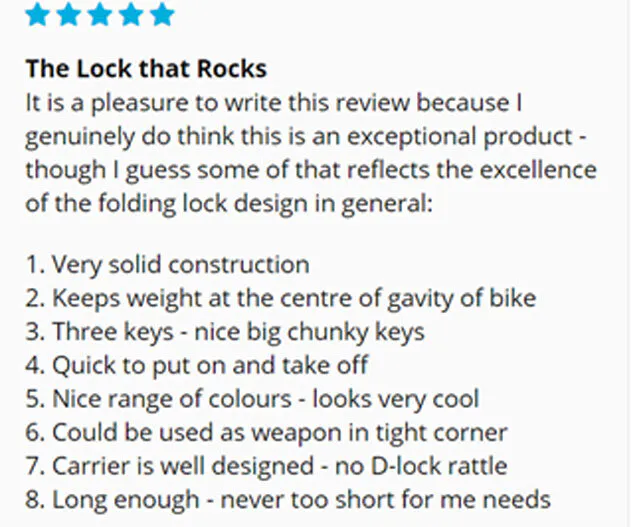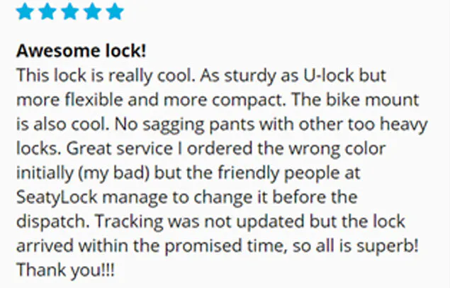 Uロックと同じくらい頑丈だけど、より柔軟でコンパクトだね。取り付けたときの見た目もかっこいいよ。他のロックのようにズボンにこすれる心配もない。サービスも素晴らしく、自分の手違いで最初間違った色を注文したけど、発送前に変更してくれたよ。ロックは約束された時間内に到着したので、すべてが素晴しかったよ!ありがとう!!!