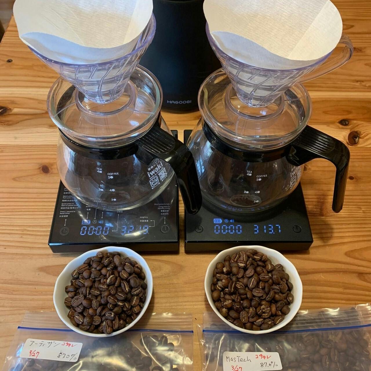 僕同様にArtisanを使って焙煎している仲間が福岡と福井と滋賀に1人ずついます。また、Artisanは使っていないけれども、デジタル温度計を仕込んだ手網を使ってプロはだしの焙煎をする友人がもう1人滋賀にいます。この4人とはいつも焙煎の情報交換をしたり、焙煎豆を送りあってブラインド・カッピングでお互いに評価しあったりしています。また東京には、富士珈機のディスカバリー焙煎機を持っている友人がおり、ときどき焙煎イベントなどします。