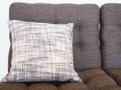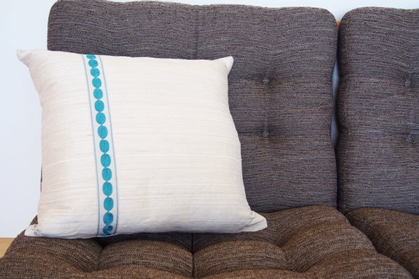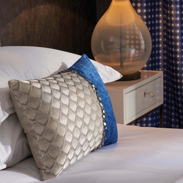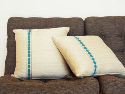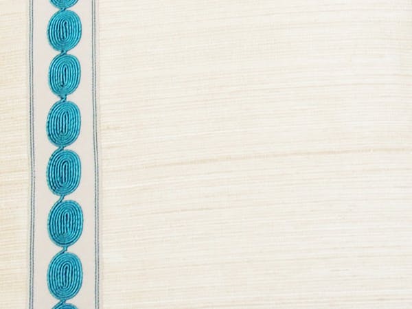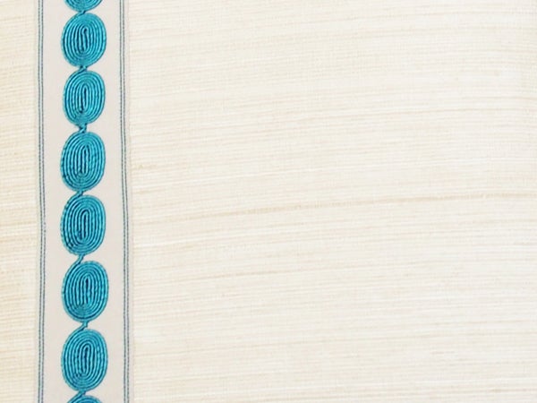 "シルク"はこの4種の生地の中で最も高級かつ最もなめらかな生地です。こちらのクッションは唯一トリム(飾り)がついていることが特徴。シルクのホワイトの生地に、トリムのライトブルーが鮮やかに映えます。このクッションは、生地はJIM THOMPSON(ジム・トンプソン)、トリムはOSBORNE & LITTLE(オズボーンアンドリトル)と、それぞれ異なるブランドのものを組み合わせて作られており、世界中のブランドと取引をしているマナトレーディングさんならではの商品といえます。