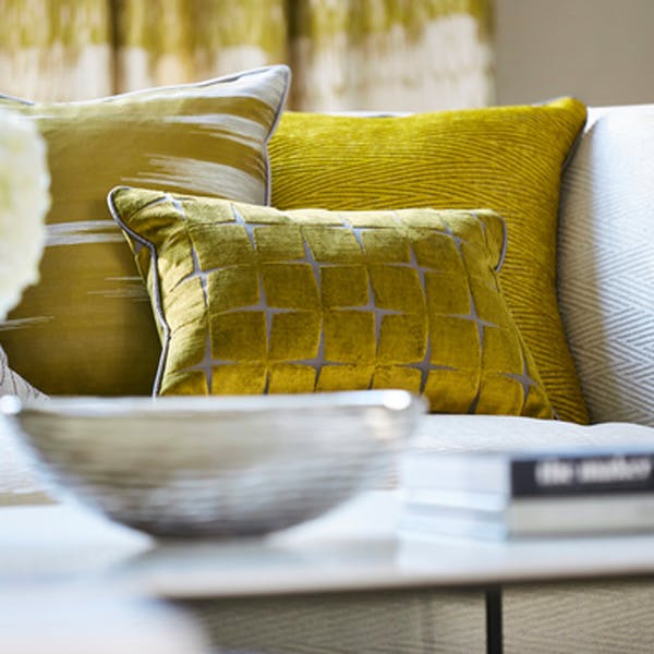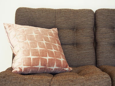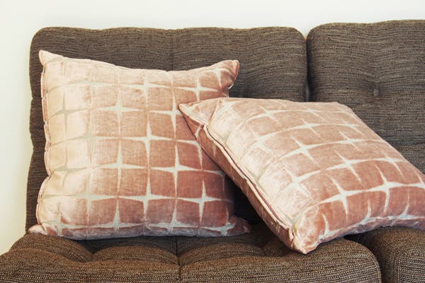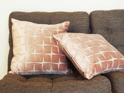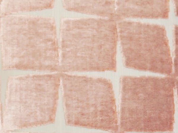 "ベルベット"は生地に光沢があるのが特徴で、ふわふわとしたさわり心地がバツグン!これからの季節はどんどん涼しくなっていくので、ふわふわのクッションは暖かくてとても気持ちが良いですよ!大きな十字の模様は、ベルベットを焼き切って仕上げた、他ではまず見ることのできない特別な意匠になっています。今回は淡いピンクをカラーに選びました。ブランドはイギリスのHARLEQUIN(ハーレクイン)です。