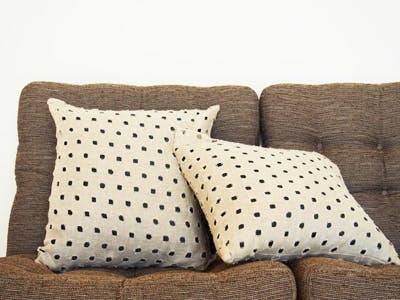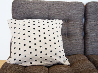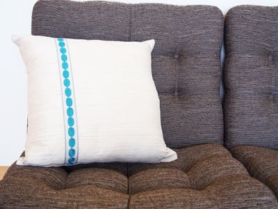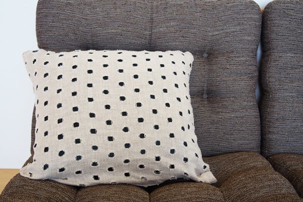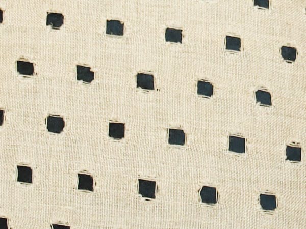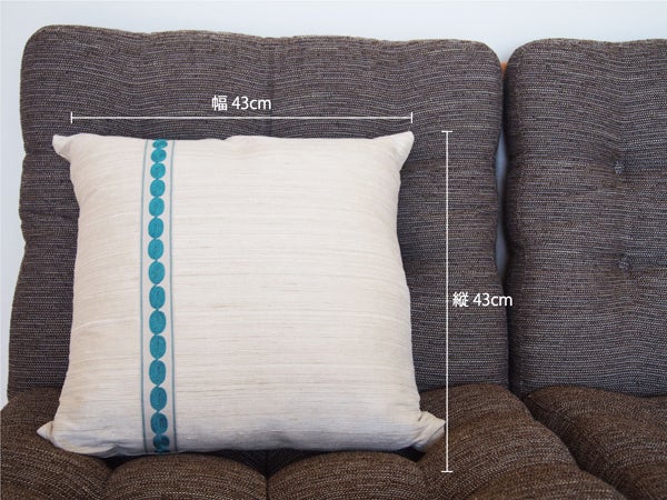 "麻(あさ)"の使用生地はドイツのSAHCO(サコ)のものです。ドット柄にくり抜いてあるこの生地は、下地として重ねたネイビーと非常に相性が良く、デザイン性の高いクッションとなっています。さらさらとした麻のさわり心地とくり抜かれた立体感の調和はとても新しく、また麻の雰囲気はナチュラルテイストのお部屋にピッタリです!