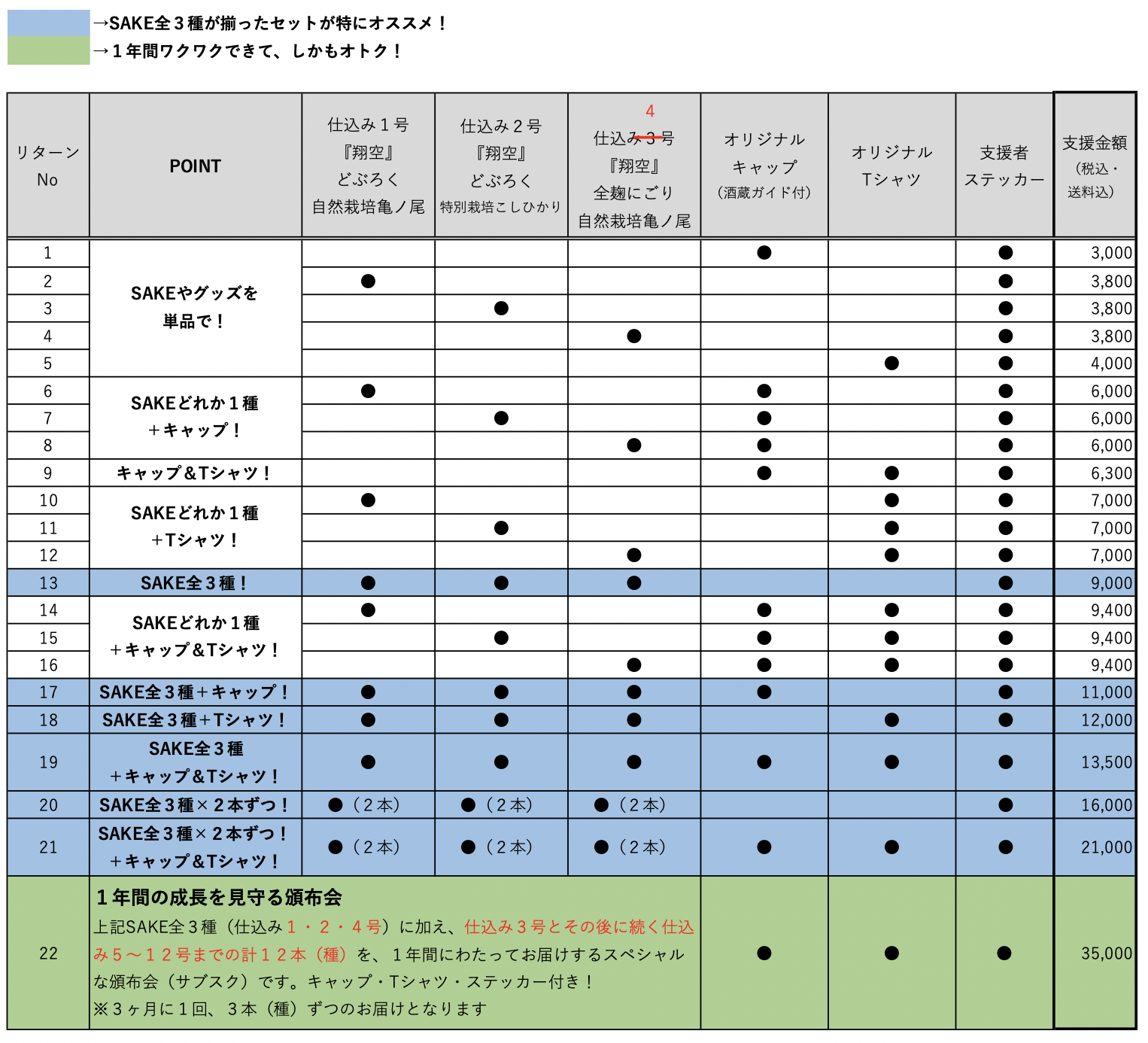 リターン一覧は規定により修正不可のため「3号」の記載が残ったままとなっておりますが、「3号」は「4号」と置き換えてお読みください。