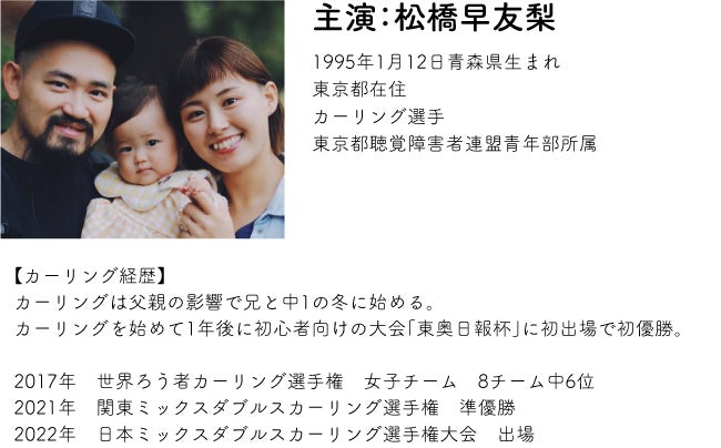 若いろう夫婦である松橋さん(聴こえない)が1歳の聴こえる赤ちゃんを育てています。母であり、カーリング選手でもある松橋早友梨さんにフォーカスし、ドキュメンタリーという形で皆さまにお届けします。子育てやカーリングというスポーツを通して、この作品をご覧になる皆さまには、きっと何かへの『気づき』があることでしょう。