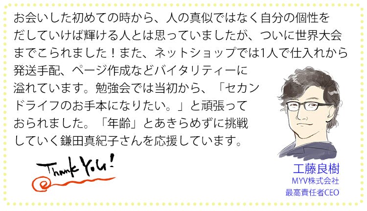 一昨年、ネットショップの勉強会グループのリーダーにもっとショップにも自分を出すように。と、いうアドバイスをうけて、ページにも私自身も出るようになり、少しづつ、出る!ということに慣れてきました。このプロジェクトは「鎌田真紀子」という人間を知ってもらえるよい機会だととらえています。