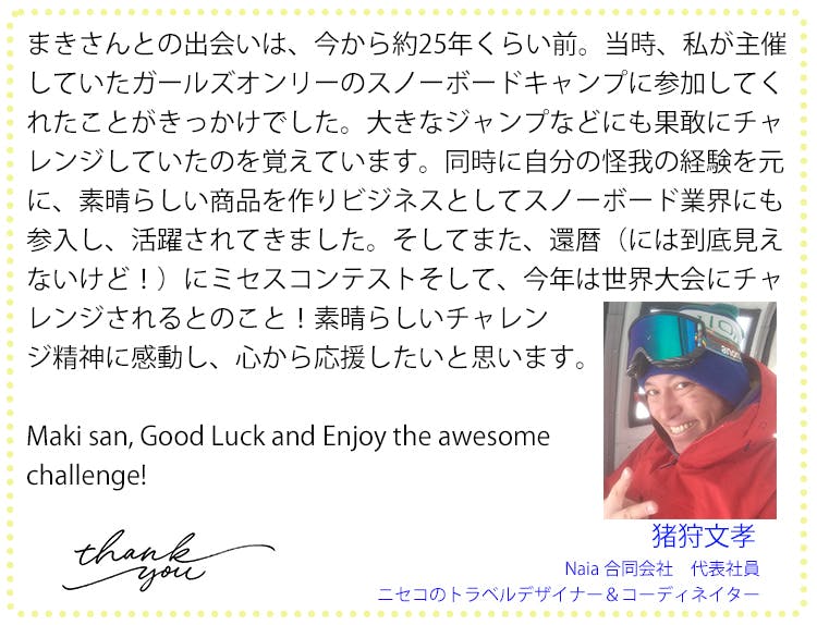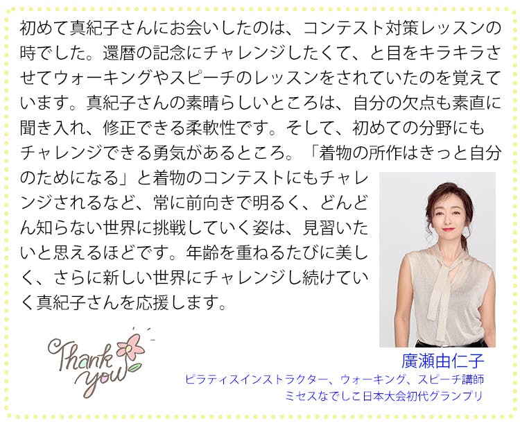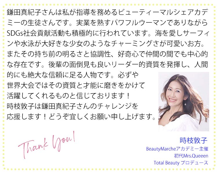 今日がこれからの人生で一番若い日です。私を世界大会、ミセスクラシックグローブに選んでいただいたことに感謝し、出来る限りの努力をして、世界の舞台に立ちます。そして、いくつになっても、自分がやりたいことにブレーキをかけないでいいということや、どんな苦難があっても夢や目標があれば、年齢に関係なく、病気をも克服し、道は開けるということをを多くの方と共感していきたいと思っています。