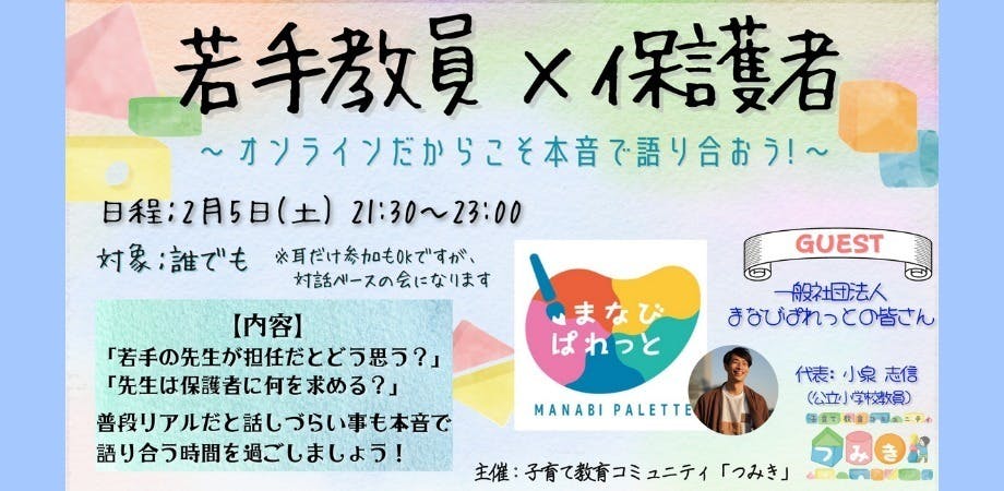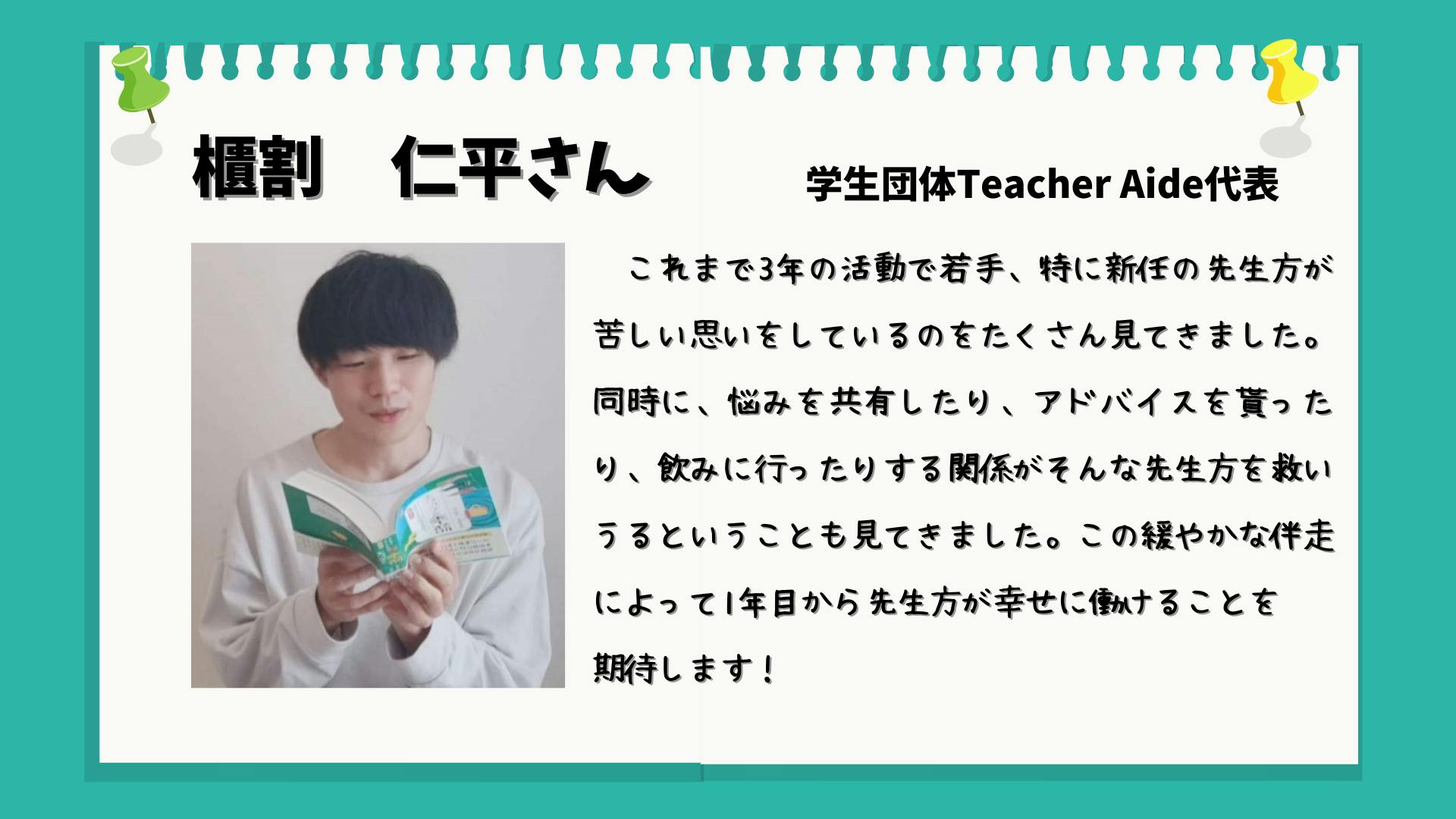 2022/02/12 14:00はじめてのせんせいプロジェクトのクラウドファンディングがスタートして2週間!早速多くの方にご支援・応援をいただいています。また応援のメッセージやSNSの投稿を読ませていただいて、とっても励まされ、改めてがんばるぞ!という気持ちになっております。ありがとうございます。今日は応援コメントが続々と届きましたのでご紹介します!!!教員の働き方改革に挑むTeachers Aide代表・櫃割仁平(じんペー)さん。先生の幸せを願っての活動はまなびぱれっとと同じ部分が多くあります。そんな2つの団体のコラボイベントが開催決定!!!若手教員であり、まなびぱれっと代表を務める小泉志信と教員の働き方改革に挑むTeachers Aide代表・櫃割仁平(じんペー)。様々なメディア、SNSなどで取り上げられている二人。華々しく活躍している!ように見えるお二人ですが、裏には色々なしくじりがあります。今回は、そんな二人の裏側トーク&交流会をこっそりお届けします。お申し込みはこちらから!https://forms.gle/9LrtnLZza3x4q3oLA<日時>2/27(日) 18:00~19:30<開催方法>Zoomを利用しオンライン開催。(交流をメインにしておりますが、画面オフ・マイクオフの参加も可能です!)<定員>100名<タイムテーブル>0:00~0:05 2人の交流のきっかけ0:05~0:20 チェックイン0:20~0:35 じんペーさん しくじりトーク0:35~0:50 グループで交流0:50~1:05 小泉志信さん しくじりトーク1:05~1:20 グループで交流1:20~1:30 団体紹介<対象>若手教員教育に関心のある学生・社会人僕たちの普段お世話になっている皆さん!!<プロフィール>小泉志信(こいずみ・しのぶ) 小学校教諭/まなびぱれっと代表理事東京学芸大学教職大学院卒。現在は教員一年目時に起業した、一般社団法人まなびぱれっとを運営しながら教員2年目として活動。教員1年目に寄り添う「はじめてのせんせい」プロジェクトやイベント等を通して、教員と教員以外の人が混ざり合う未来の実現を目指す。https://manabipalette.com/クラウドファンディング実施中https://camp-fire.jp/projects/view/544226櫃割仁平(ひつわり・じんぺい) Teacher Aide 共同代表1995年生まれ。京都教育大学を卒業後、京都大学大学院教育学研究科に進学し、心理学を研究。京都教育大学在学中の2018年に学生団体「Teacher Aide」を立ち上げ、全国35支部約300人のメンバーとともに、共同代表として各地の教員志望の学生と連携してイベントなどの活動を精力的にこなす。https://peraichi.com/landing_pages/view/teacheraidekyotoみなさんにお会いできるのを楽しみにしています!! もっと見る