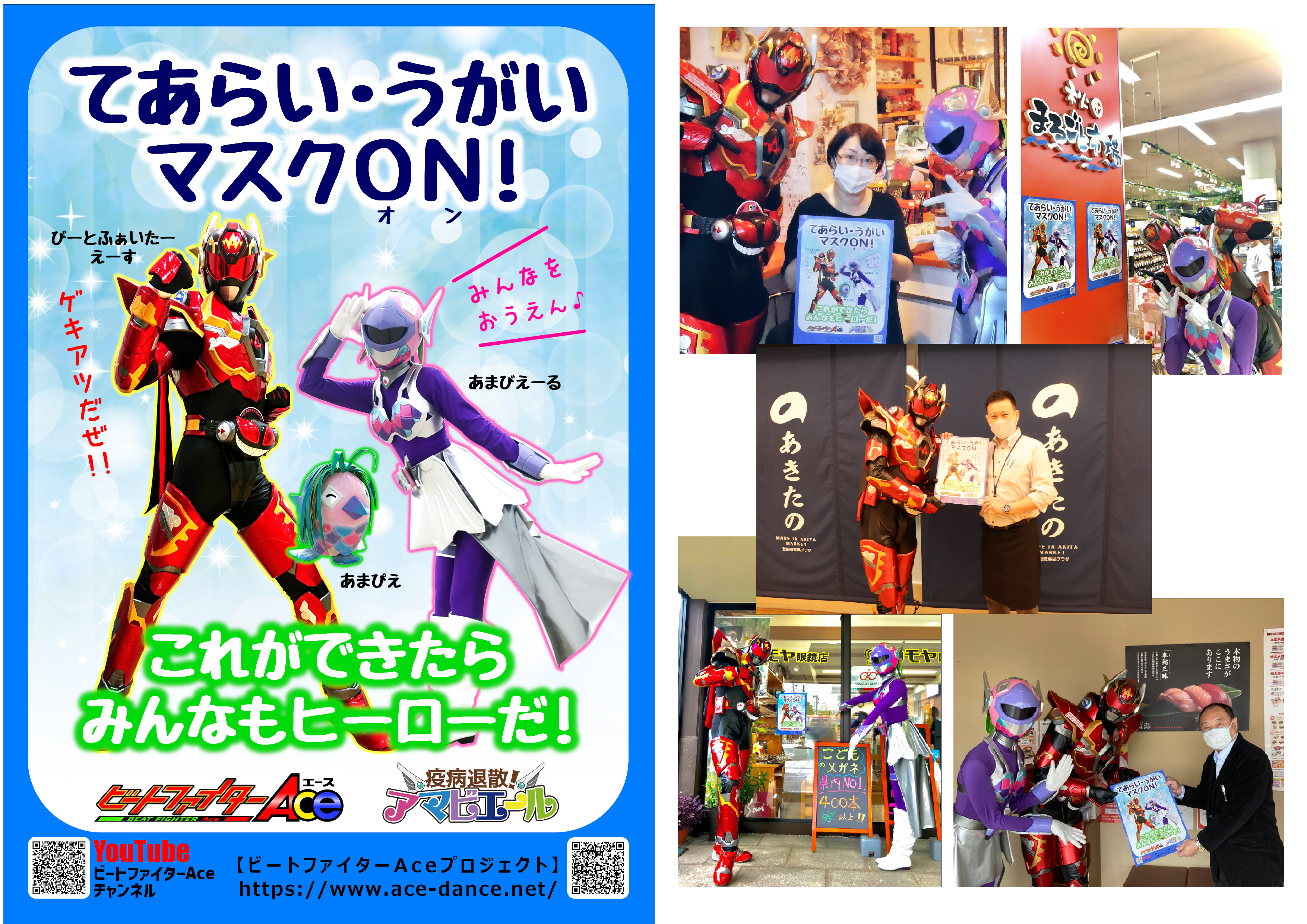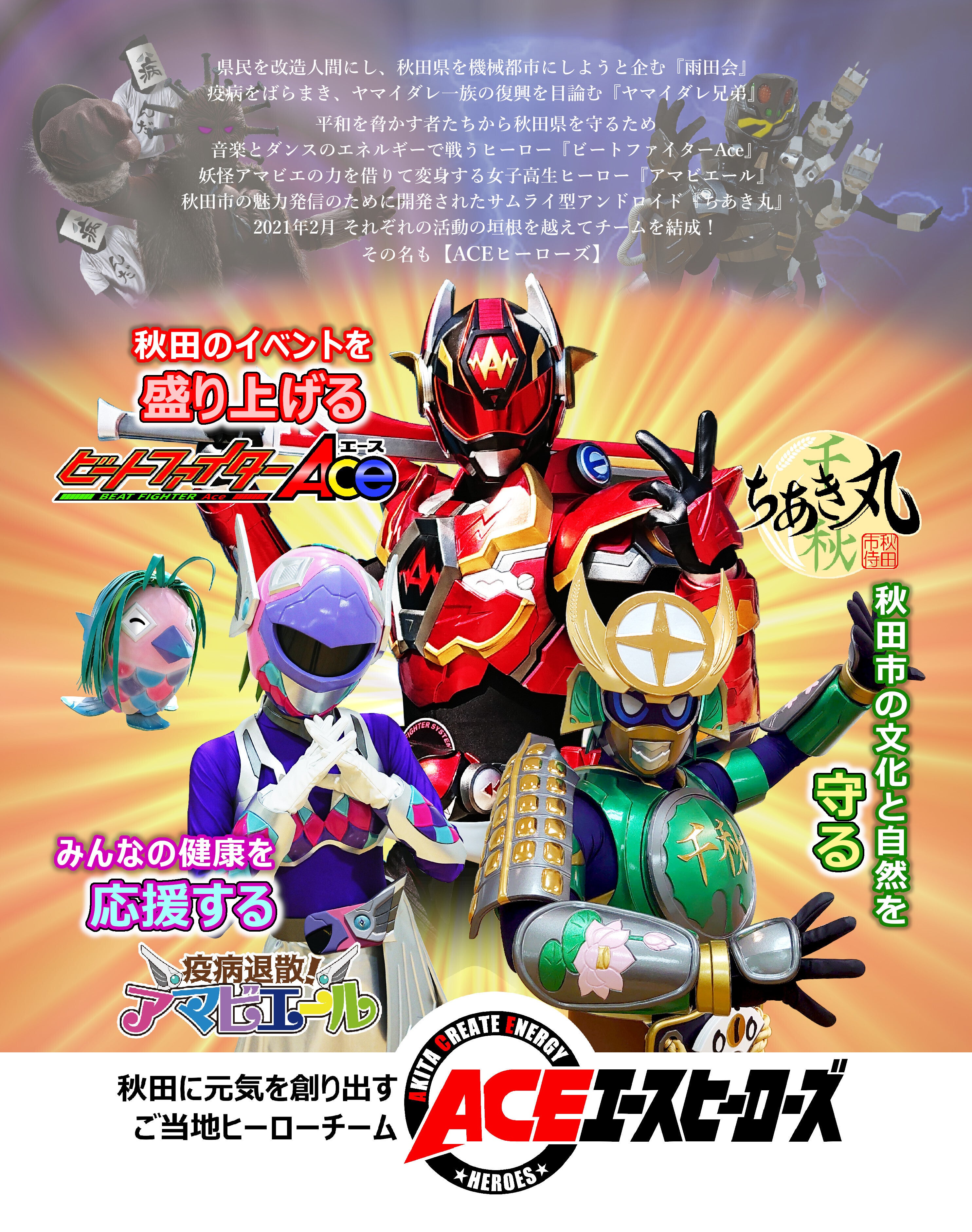ビートファイターAceプロジェクトは「Akita Create Energy」という精神を掲げ、ヒーローショーを通して、秋田を盛り上げることを目的に活動しています。