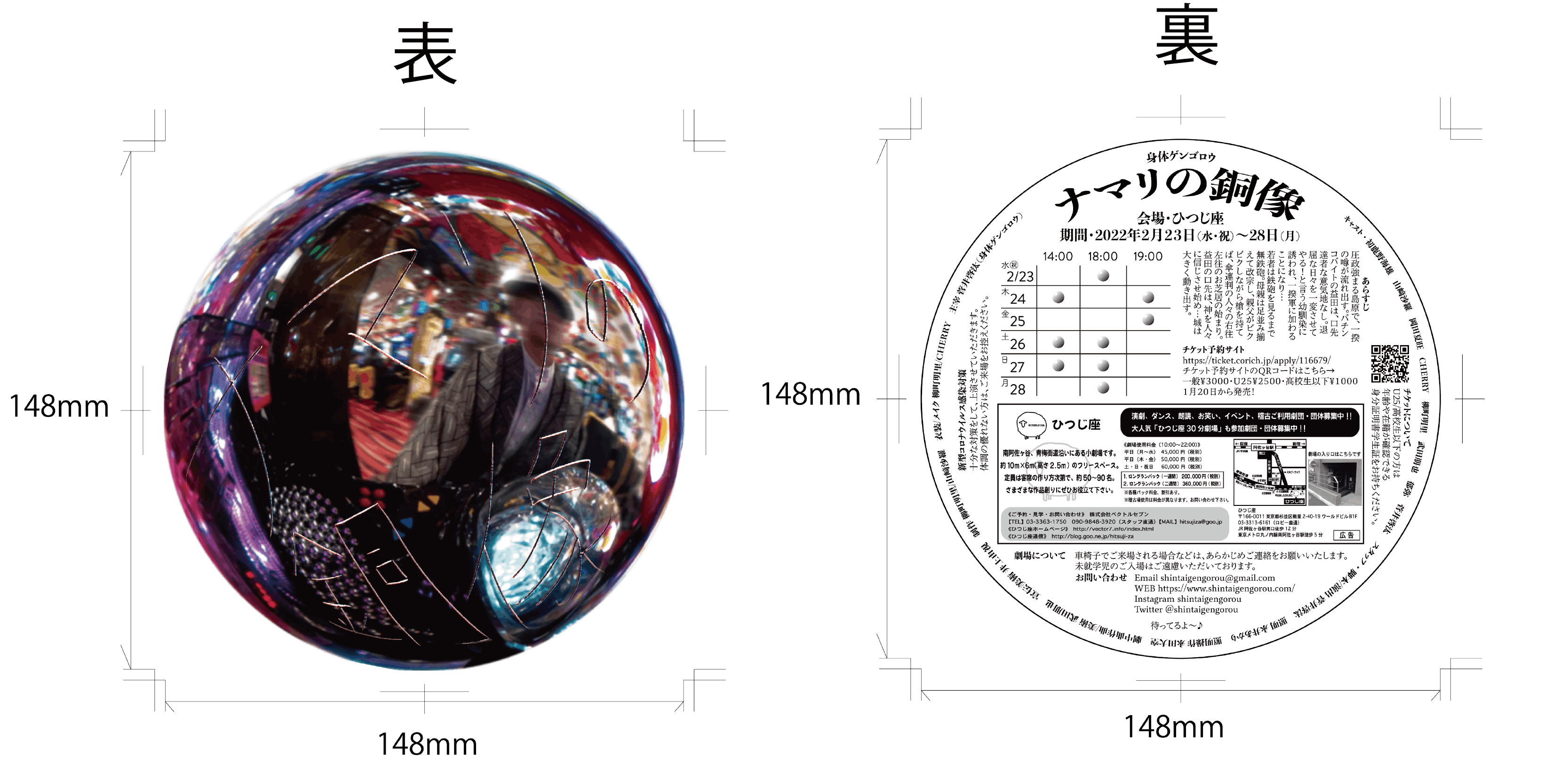 本公演のために制作された、少し変わった円形フライヤー。小さめで可愛らしい円形の紙面に、本公演情報と、演劇への愛をギュッと詰め込みました!