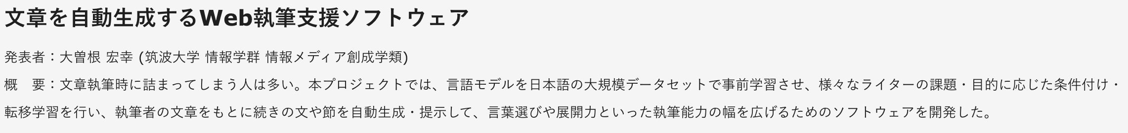 注意点としましては、AI BunChoの実運用に用いているモデルではない点です。それを作る前段階に学習させた、汎用的なモデルになっています。例えばニュース記事の生成などに向いています。