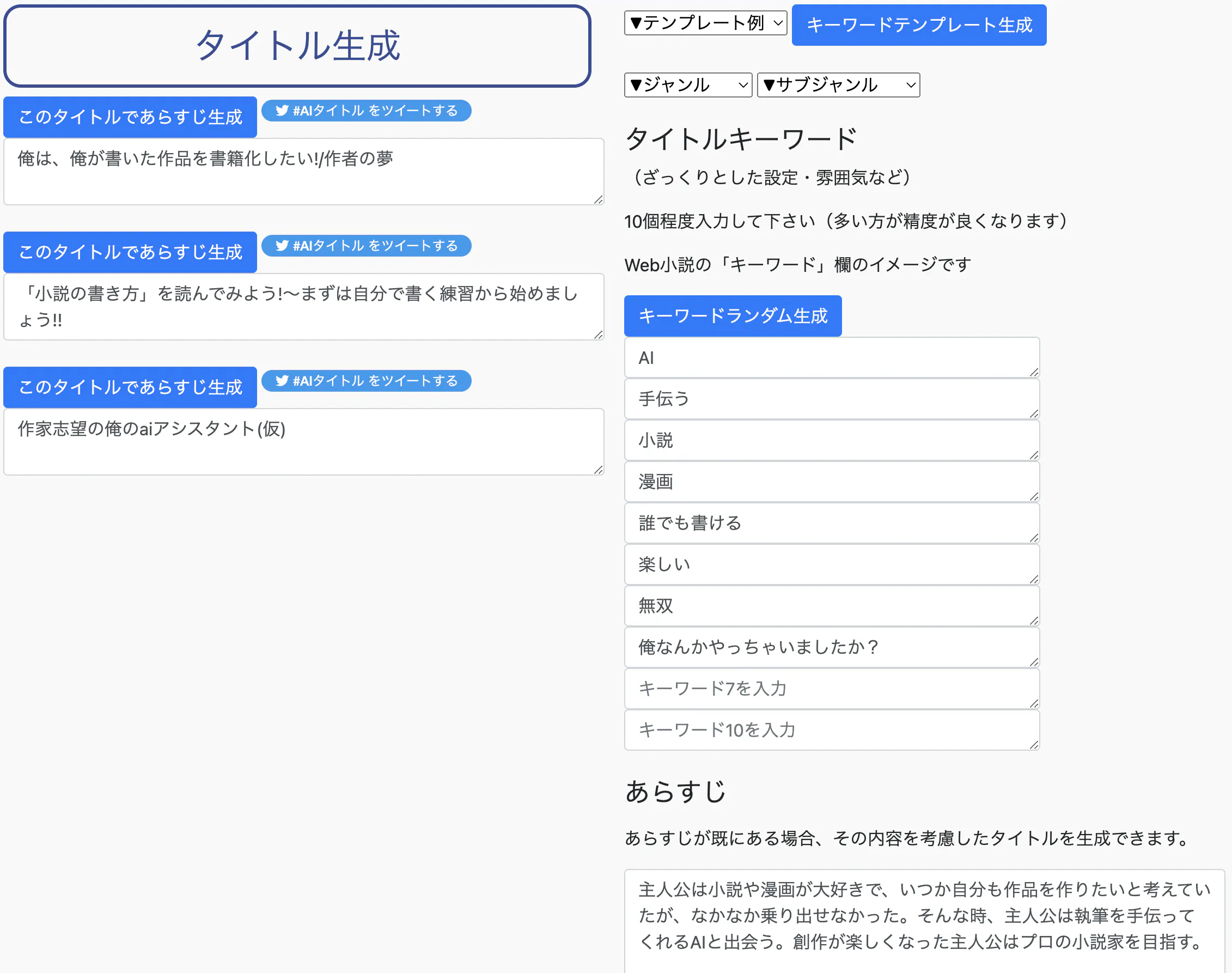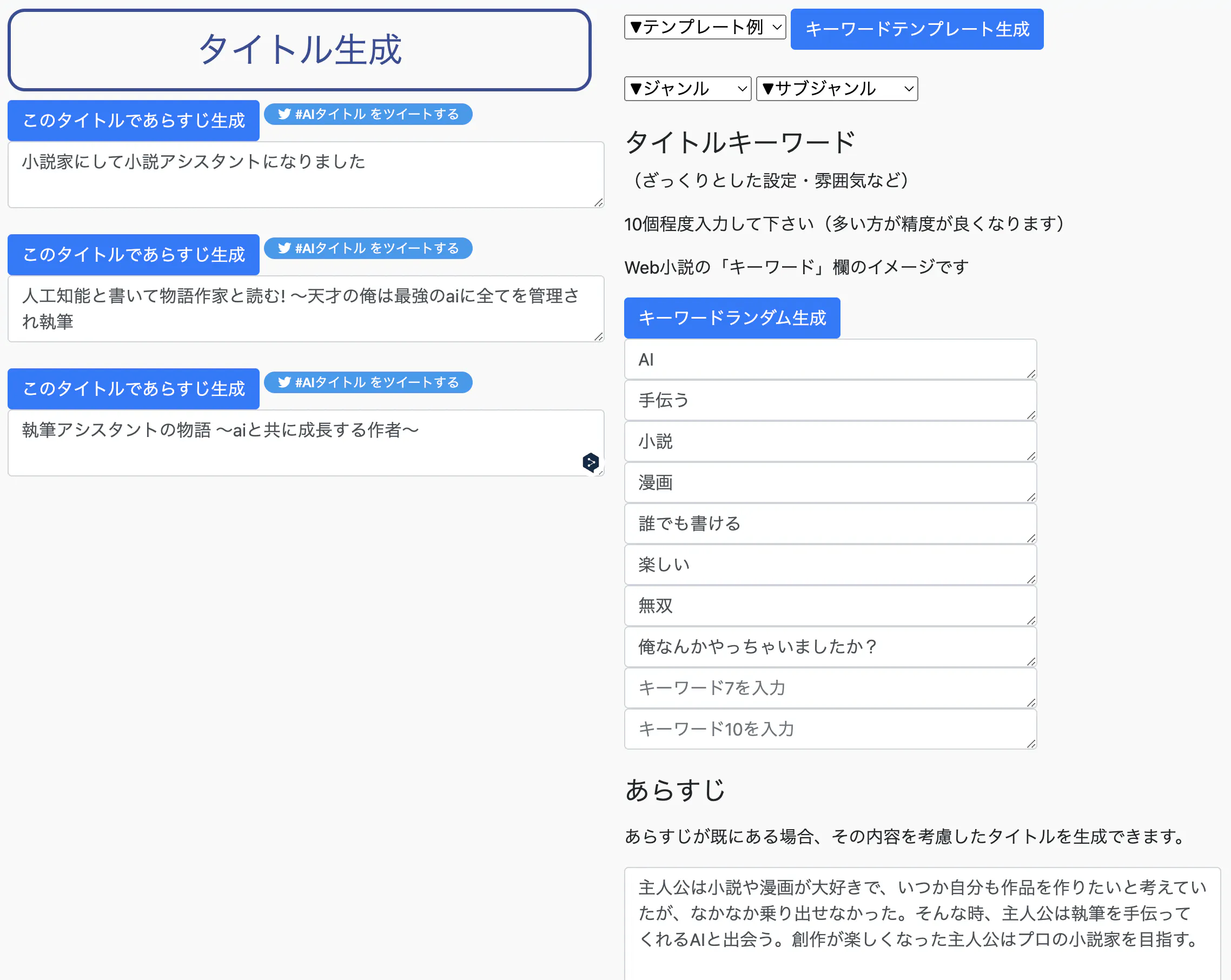 OK! 例えばタイトル生成では、こんなふうにキーワードやあらすじを入力すると、タイトルを提案することができるんだ