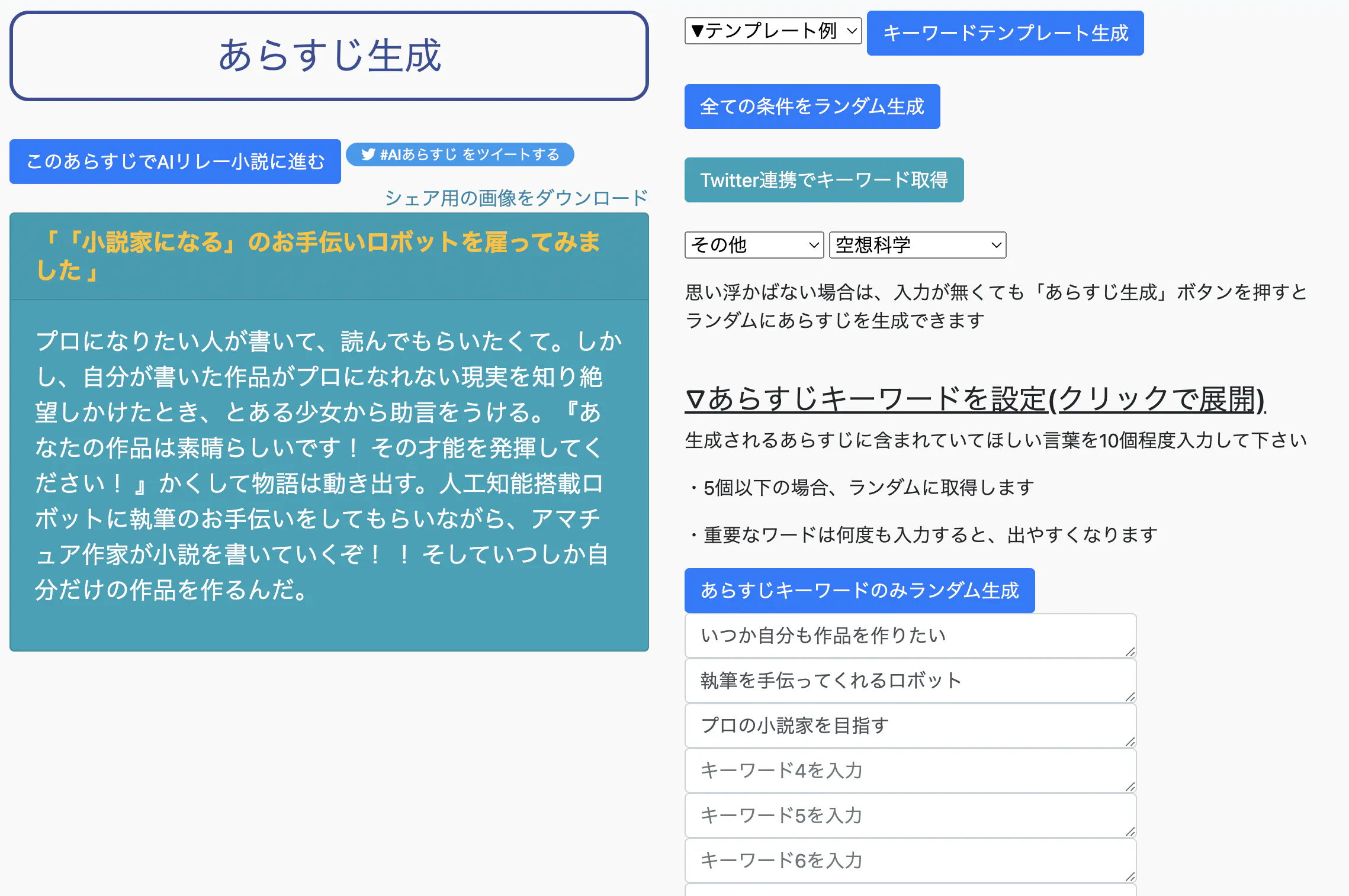 こんな風にあらすじに含めたいキーワードや断片を入力すると、それを出来るだけ含めるようにして提案するよ