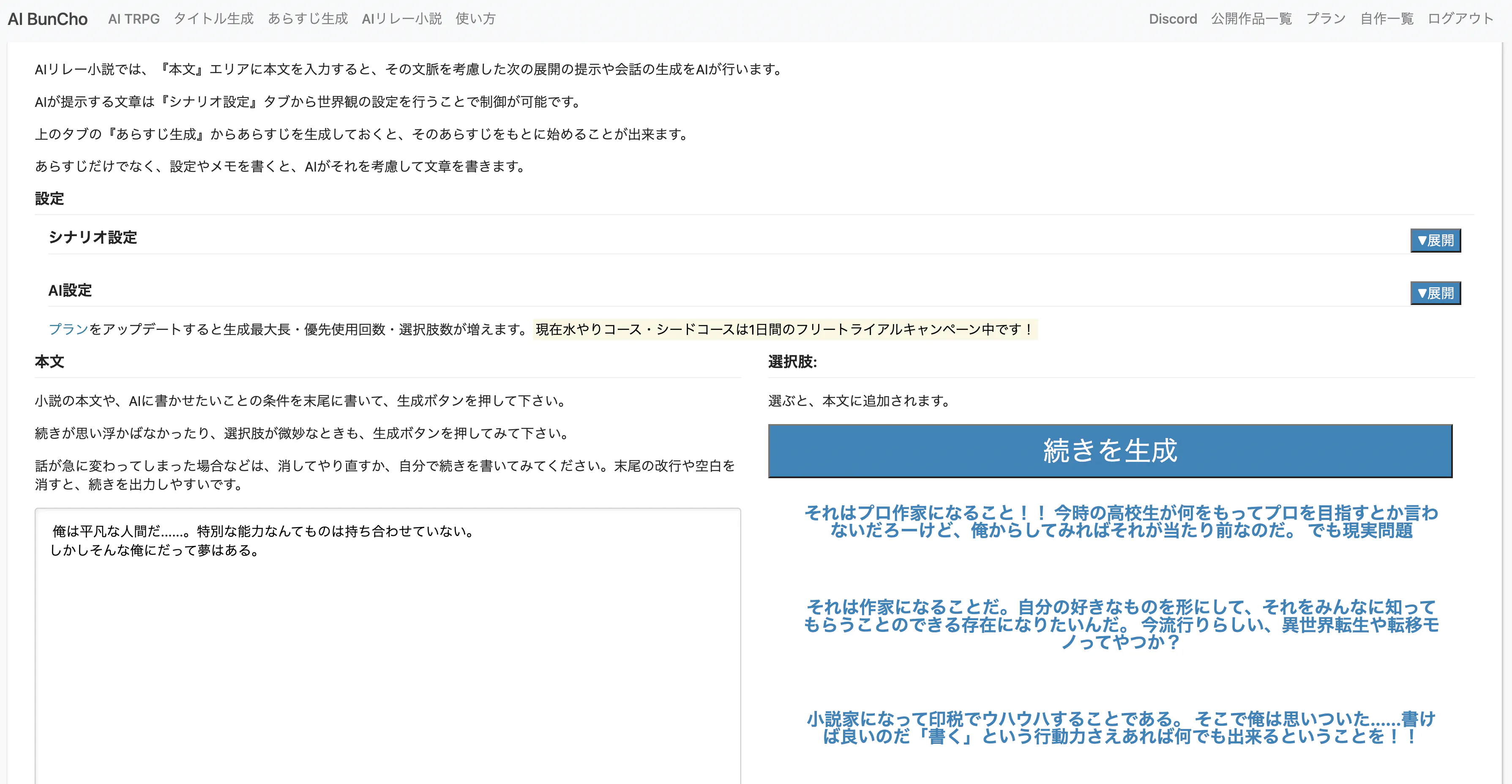 『このあらすじでAIリレー小説に進む』を押すと、生成したタイトル・あらすじとキーワードをもとにAIが本文を提案する画面に移るよ