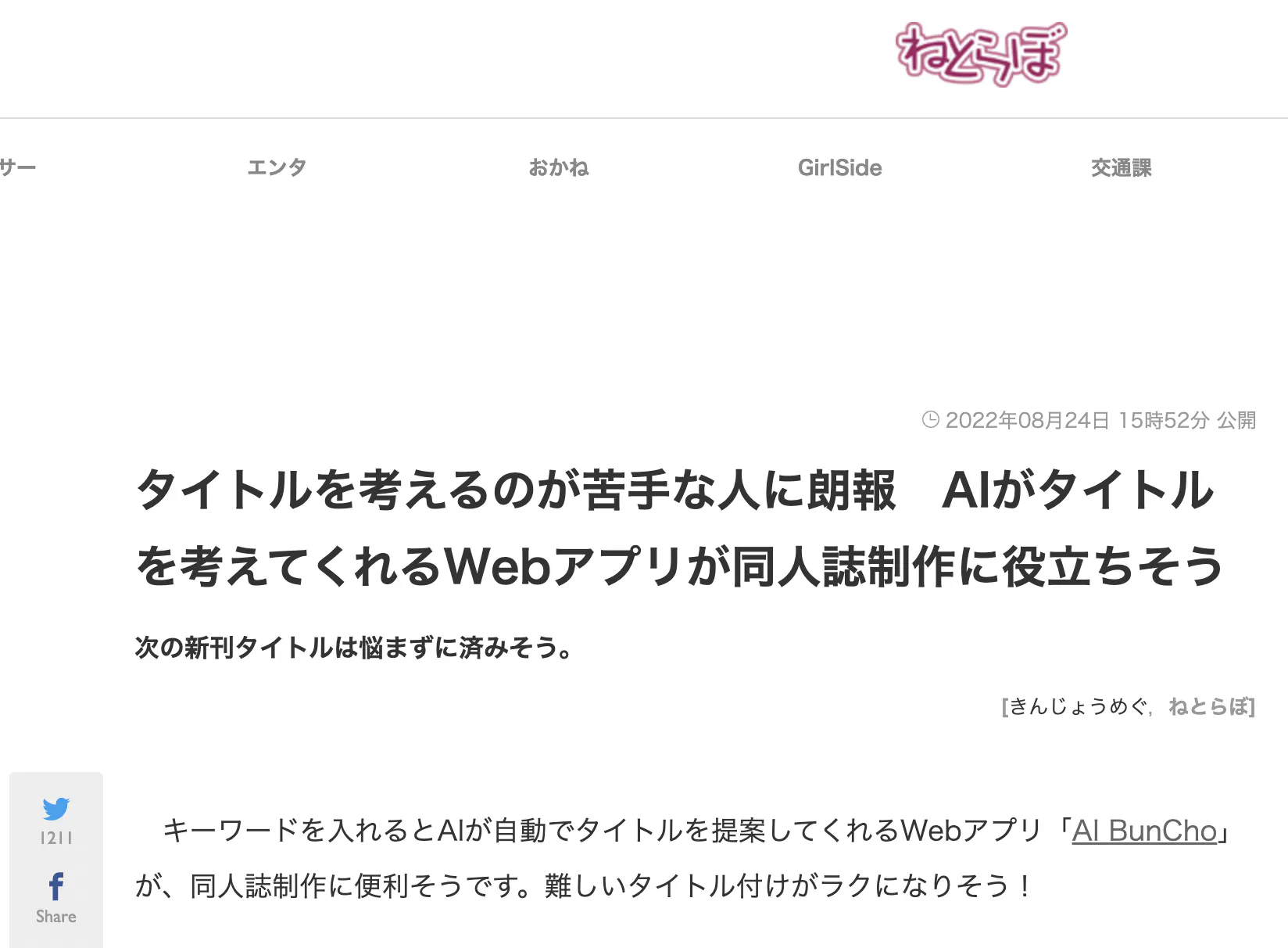 *2 「タイトルを考えるのが苦手な人に朗報 AIがタイトルを考えてくれるWebアプリが同人誌制作に役立ちそう」, きんじょうめぐ, https://nlab.itmedia.co.jp/nl/articles/2208/24/news154.html, (参照 2022年8月28日)掲載許可をいただいております。