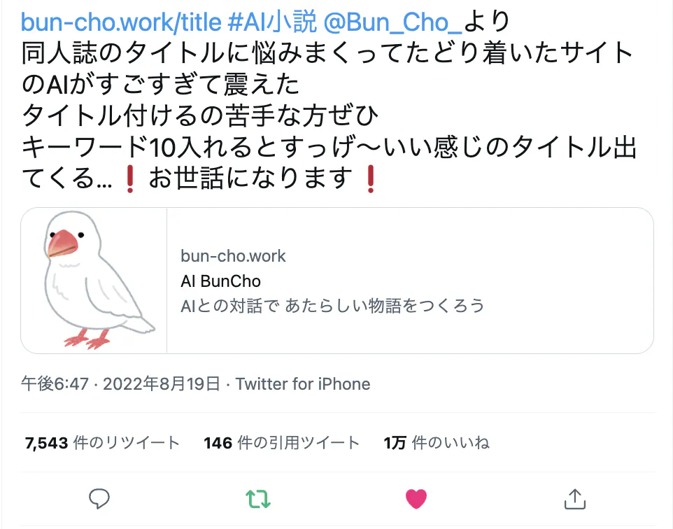 AI BunChoを用いた作品を執筆されていることを公表されており、大変励みになっております。