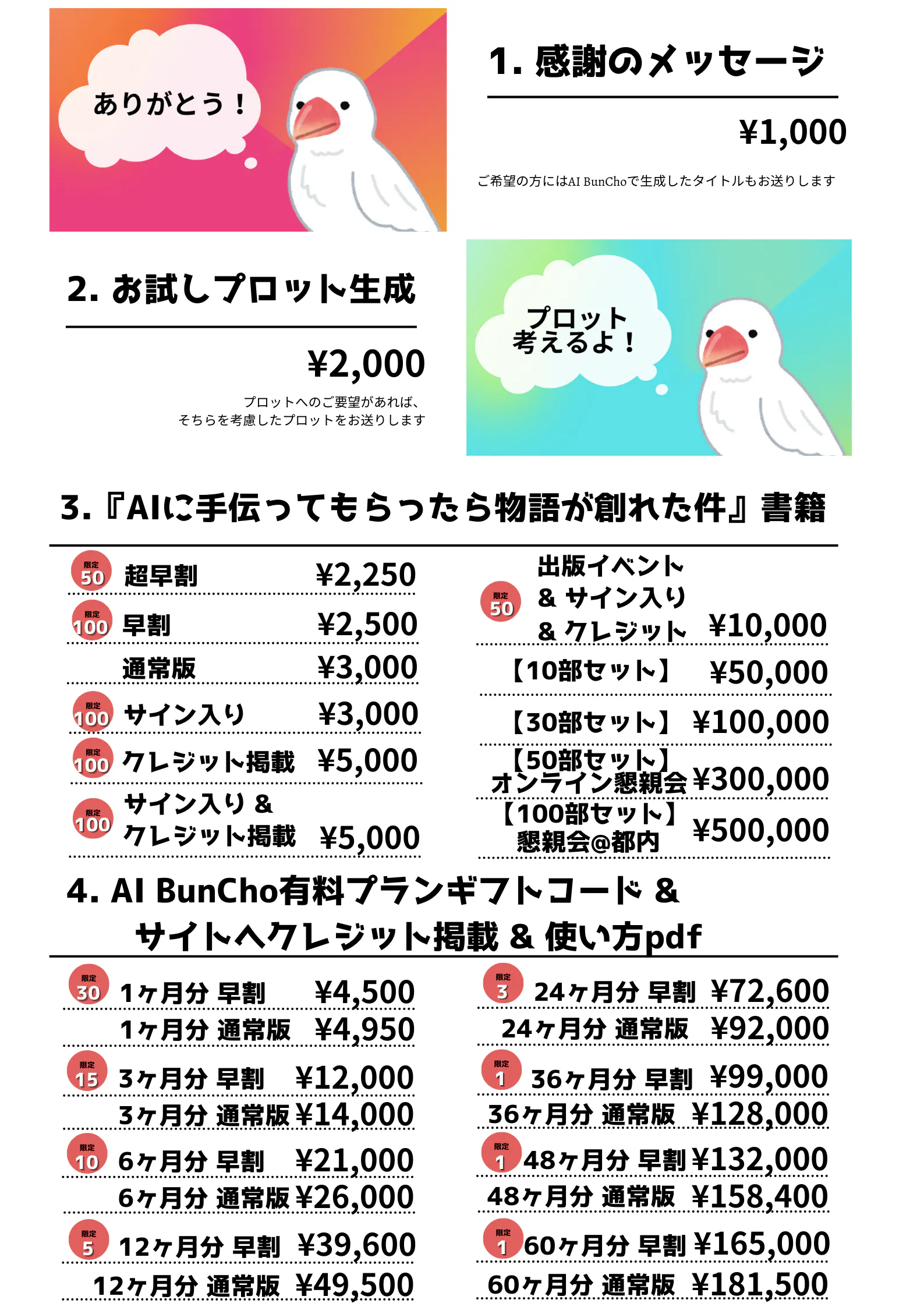 4. AI BunChoの有料プランのギフトコード & サイトへクレジット掲載 & 使い方pdfプレゼント