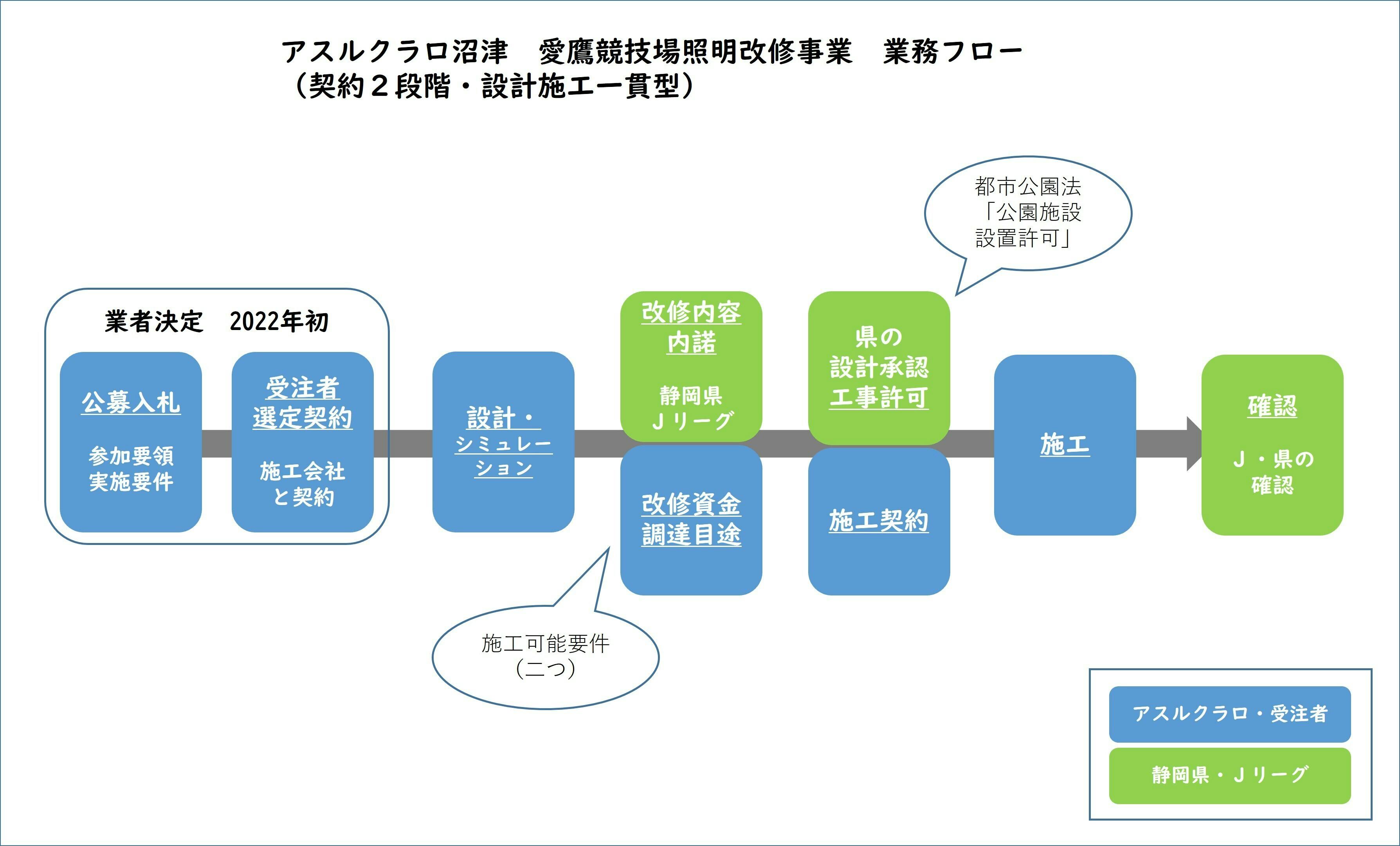 今後、受注者様での設計やシミュレーション検討を経て、①静岡県様及びJリーグの改修設計内容の内諾、②改修資金の調達、という2要件を整え施工契約に移ります。工事のおおまかな流れはイメージ図のとおりです。