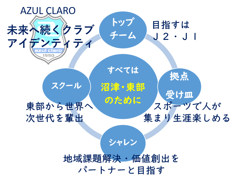 本クラウドファンディング公開に際し、われわれは何のためにクラブ事業を営んでいるのか、その存在意義は何なのか今一度考え、クラブアイデンティティとして表現しました。30年に渡り様々な事業を行ってまいりましたが、気持ちはたった一つだけ、発祥の沼津・静岡県東部を誰もが体を動かしてスポーツが楽しめる地域にしたい、このふるさとをよりよくしたいという思いです。
